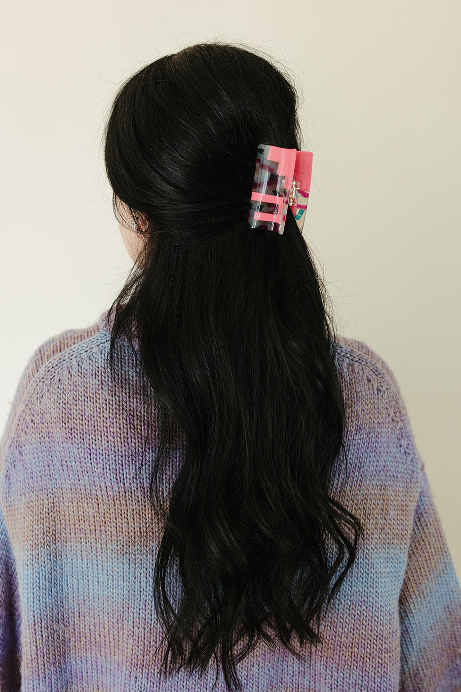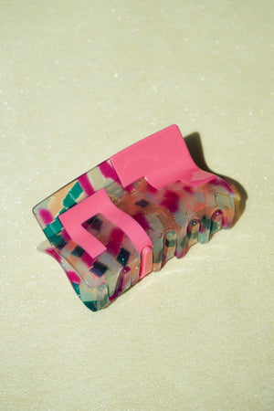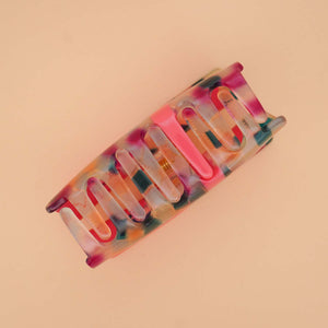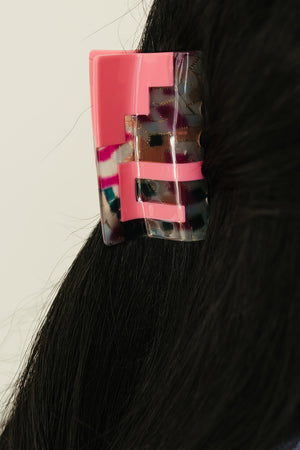 The Greca hair-claw features a fun pink and confetti design inspired by the cool Mayan rectangular spiral pattern. It’s just the right size to hold medium to long hair up in a bun or half bun, adding a playful pop to your look while keeping your hair secure.