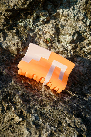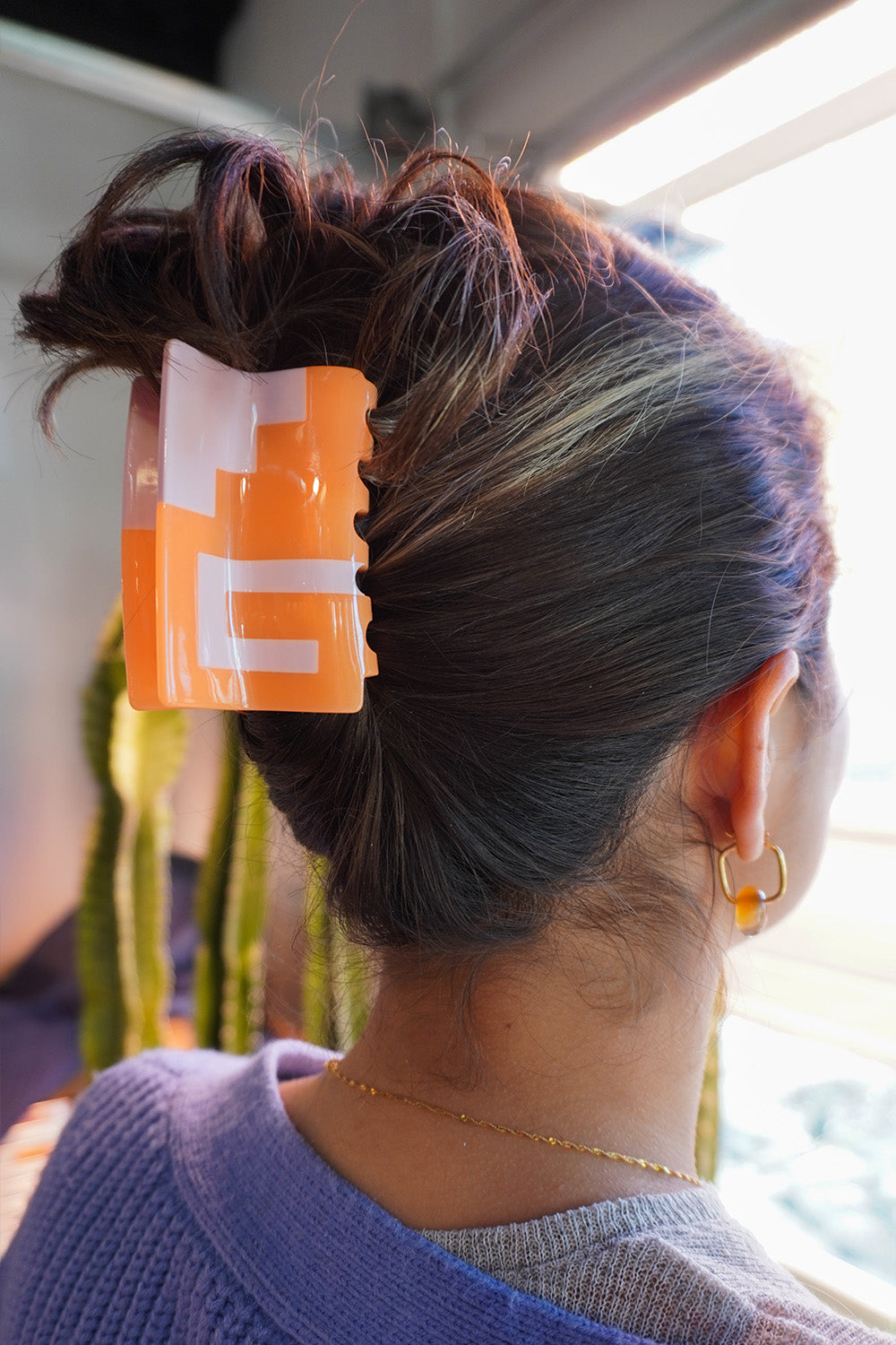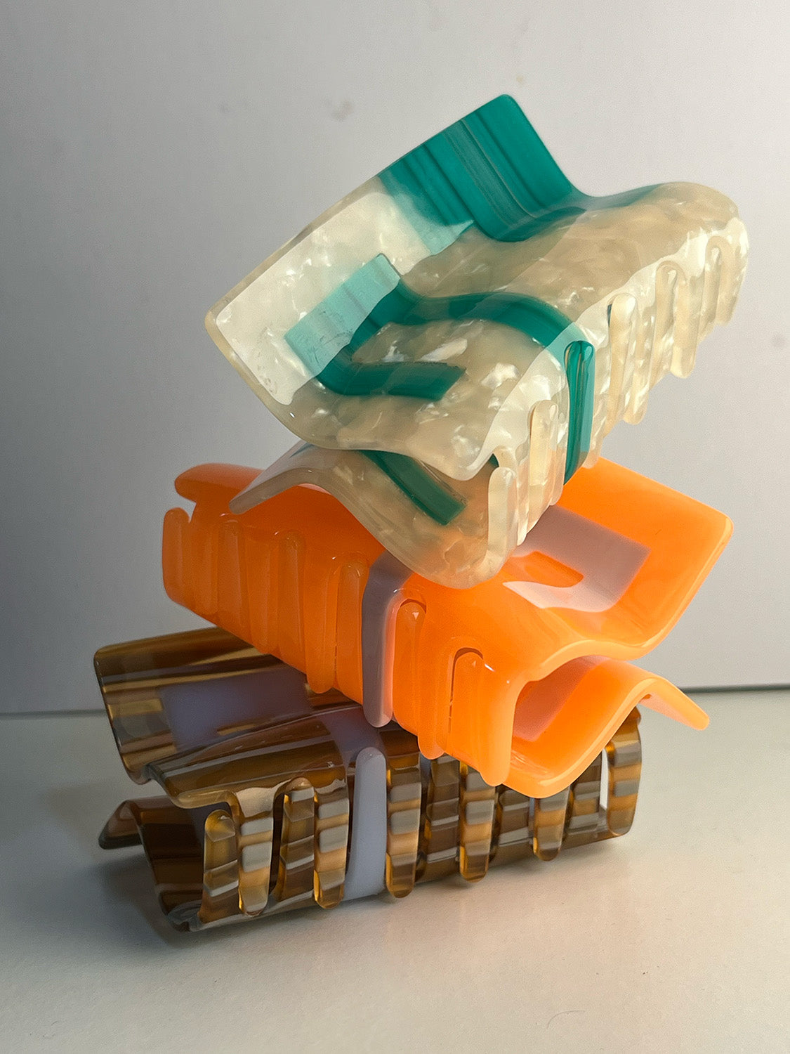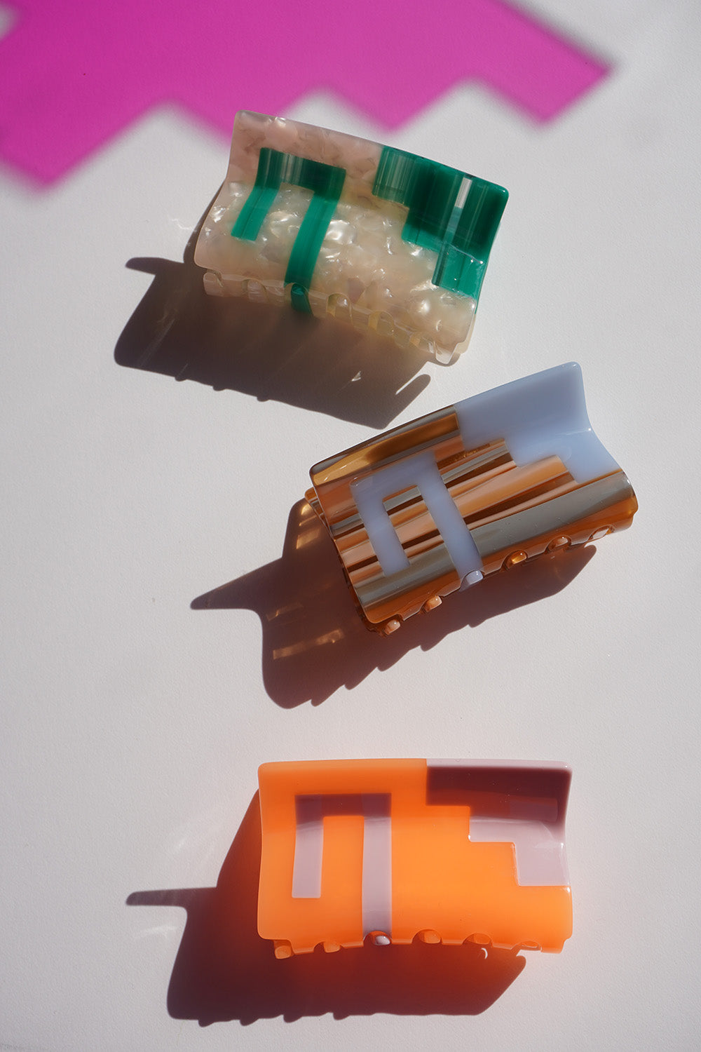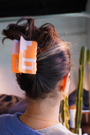 The Mayan greca is a geometric spiral that is a reoccurring decorative pattern used in Mayan architecture. This pattern would be carved out the stone buildings creating a three-dimensional relief effect on the facade of important buildings. This pattern would often be associated with the concept of duality, order and life itself. The greta claw comes in three different color combinations; periwinkle paired with a stripped neutrals. Neon pink with light pink and teal with cream color. This medium size hair-claw will hold your hair up really well in a bun or in a half bun. Ideal for those with medium or long hair length. Claw is made out of acetate and measures 3.5" x 2" x 2."