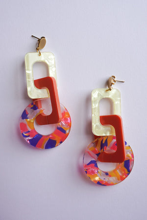 Our link and circle earrings have been a beloved design since the beginning. Now, we've brought them back after a year, but with a twist - using vibrant limocello, papaya, and confetti acrylics. These earrings are the epitome of a statement piece - fun, bright, one-of-a-kind, and lightweight. And to top it off, they have an elegant touch with a round brass stud.