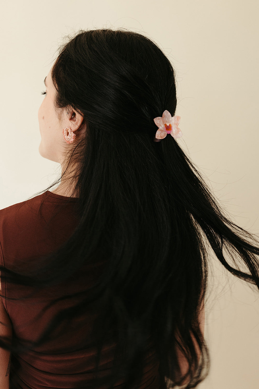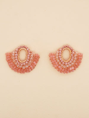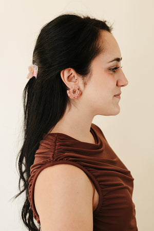Soft blush tones, shimmering beads, and sculptural movement come together in the Reflejo Earrings. Handcrafted with delicate layers that catch the light from every angle, these statement studs feel both romantic and modern—perfect for adding an artful touch to any look. Only three pairs available.