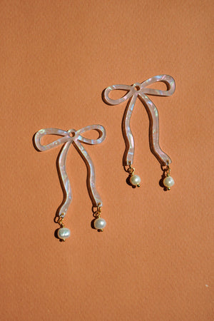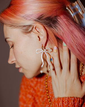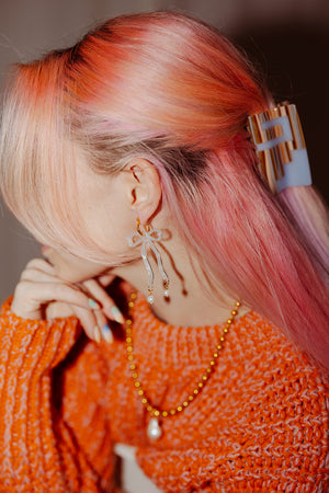 These dreamy iridescent bow hoops shimmer with every move, catching light (and attention) like magic. Topped off with dainty pearl drops, they’re the perfect mix of sweet and statement. Whether you're...