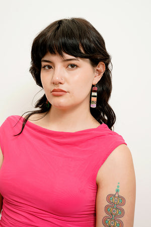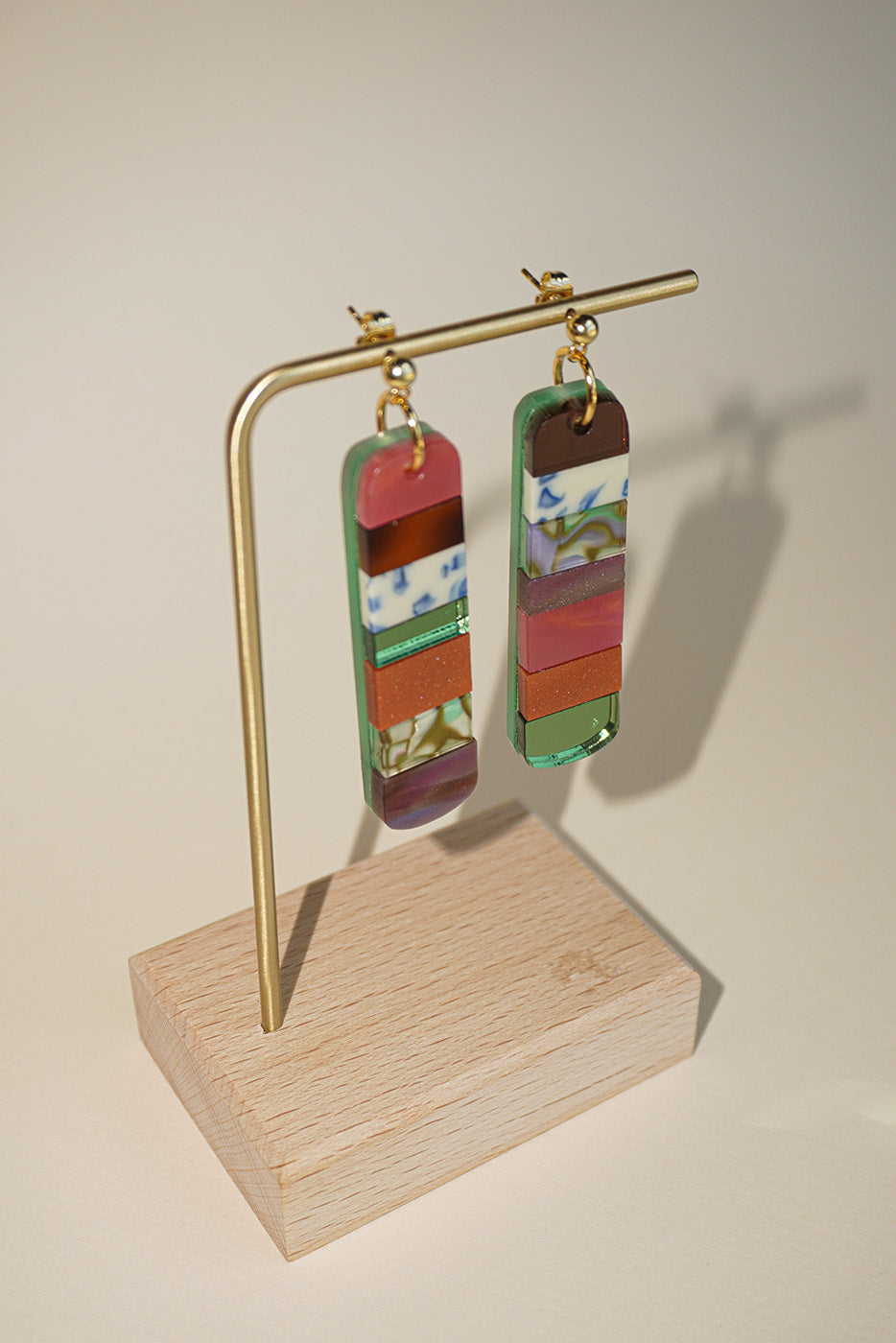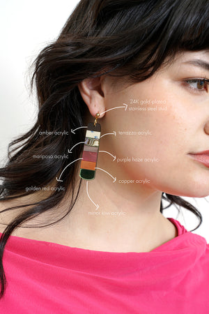 These very special acrylic earrings are made with over eight different textures that layer so perfectly with each other. The intention was to incorporate stripes in a unique way while creating a statement earring. Each earring measures 2.5" by .65" and they are lightweight. The pieces in this collection are all made in collaboration with local artist Riley Rouse. Learn more about Riley by following her along on @rileymakesthings.