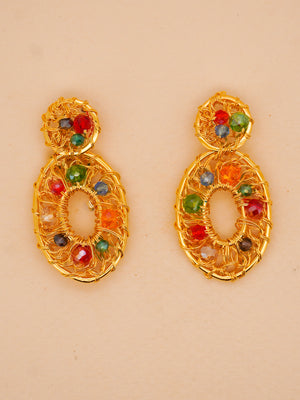 Elegant and lightweight, these hand-crocheted earrings are a true work of art, hand crafted by skilled Brazilian artisans. Using a delicate open-mesh crochet technique, they weave shimmering 18 karat gold filled wire with dazzling crystals and beads of varying sizes, creating a stunning interplay of texture and light. Despite their intricate design, these earrings remain feather-light and comfortable for all-day wear. These are part of our curated statement earrings collection, available in very limited quantities.