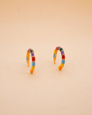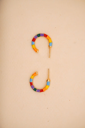Everyday boldness with these 18K Gold Filled Colorful Enamel Open Hoop Stud Earrings. These stunning earrings feature a vibrant array of colors and a unique open hoop design, perfect for adding a touch of risk-taking to any outfit. Get ready to turn heads and make a statement with our earrings on your ears.