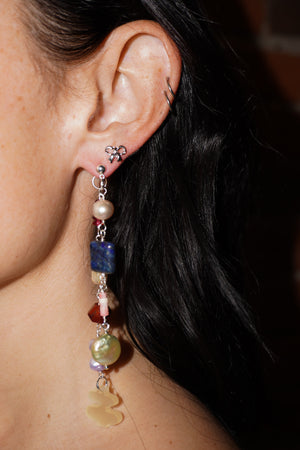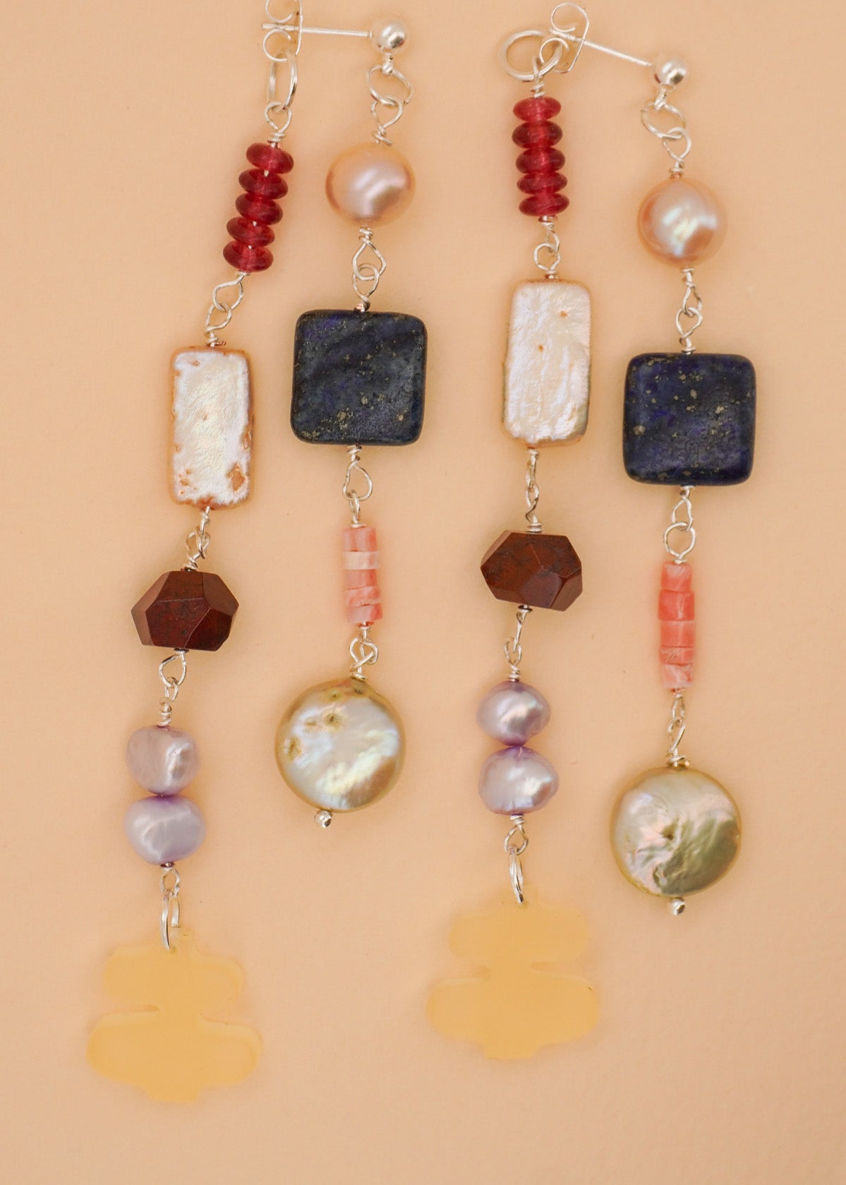 Shimmer into the new season with these playful ear jackets. Crafted with silver-plated findings, acrylic charms, and natural stones like pearls, shell, ruby, and lapis, they strike the perfect balance of edgy and elegant. Their two-part front-and-back design adds depth, movement, and versatility to your look. Lightweight yet bold—perfect for day-to-night styling. Only a few pairs available.