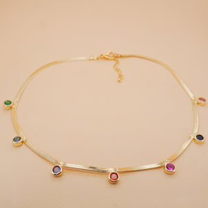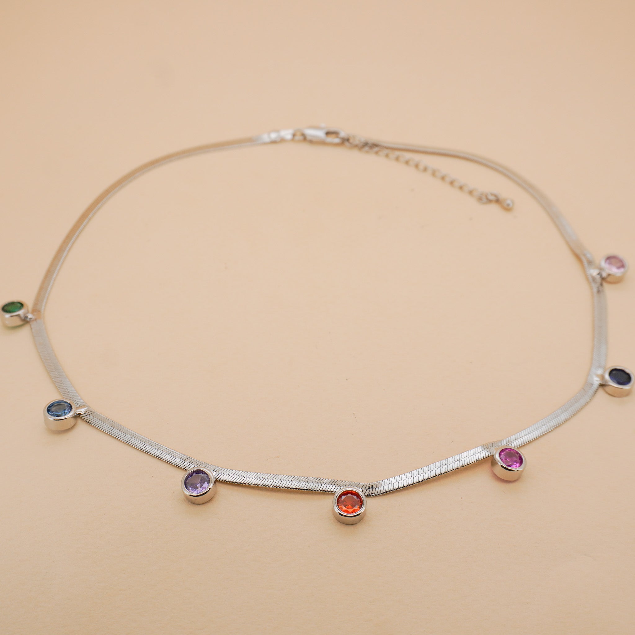 A classic herringbone—now with a technicolor twist. This sleek, multicolor CZ–studded chain brings instant shine, movement, and main-character energy to your neckline. Wear it solo for allowing it to shine on...
