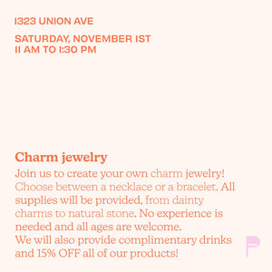 Join us for another creative morning, this time at our Studio located at 1323 Union Ave, Kansas City, MO 64101 on Saturday November 1st from 11AM to 1:30PM! We so excited to be offering a new workshop that is solely focused on personalizing your jewelry using all of our charms. We will be offering over 40+ different charms to choose from and we will teach you how to assemble them all to your chosen jewelry item! Your ticket will include all the materials you need to make a necklace or a bracelet with an unlimited amount of charms. There is no experience needed to take this class. Limited seating is available and workshops sell fast so get your spots asap. We will provide drinks and an additional 15% OFF to shop our displayed collections. Cancelation policy: if you purchase a ticket and are no longer able to attend, please email us pauoterodesigns@gmail.com with at least 48 hrs in advance, otherwise we will not be able to refund you.