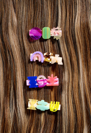 These mobile hair clips come in four fun styles, each set with unique shapes and textures. Each clip has its own vibe, so you can pick which set matches your style...