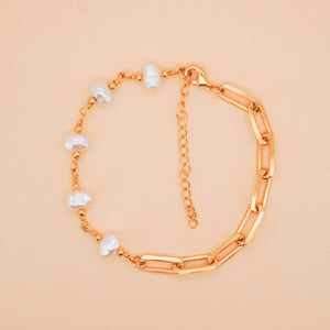 This bracelet is a very cute and delicately charming option with a fun twist. It is made with half faux beaded pearls and the other half is a chunky paper-clip chain.