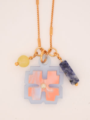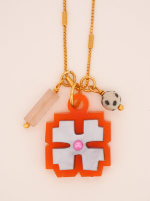 A delicate balance of playful and refined, this necklace features a handcrafted acrylic floral charm paired with two natural stone accents for an organic, one-of-a-kind touch. Suspended on a dainty gold-filled...