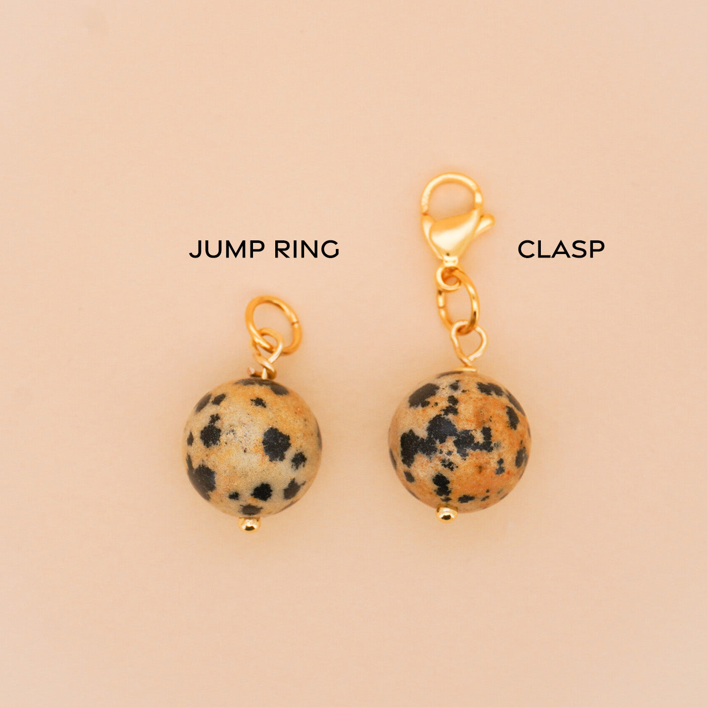 One of our favorite stones; Dalmatian Jasper. A touch of speckles and earthy tones in a charm that will go with everything. This stone is like a fun neutral that will make a perfect dainty charm. Wear it on its own or layer it with some other ones of our charm options. Select the proper attachment for your charm. Complete the look with the Vintage Candy Beaded Necklace.