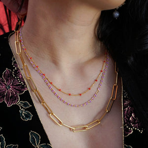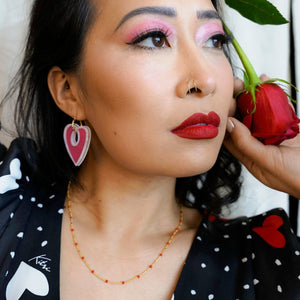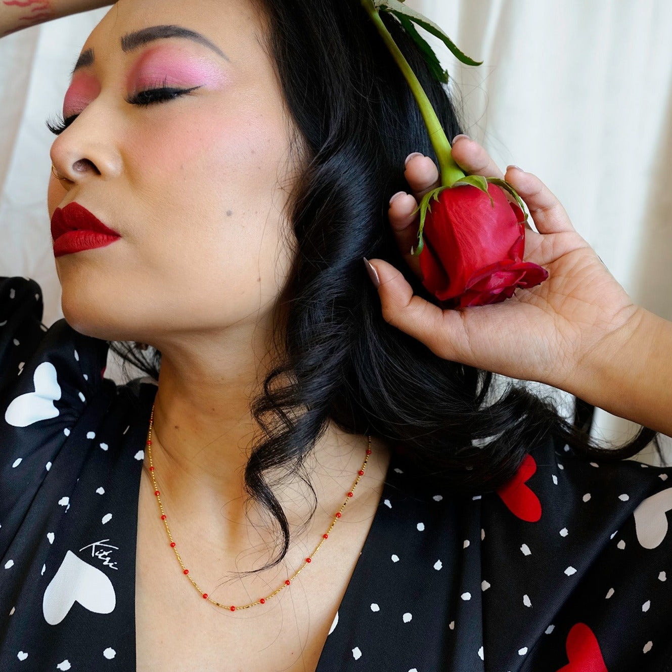 This cute little necklace is a great addition to your collection. Red is a hot color at the moment and this adds the perfect pop of fun to your style. Necklace chain is made out of plated gold brass with enamel details