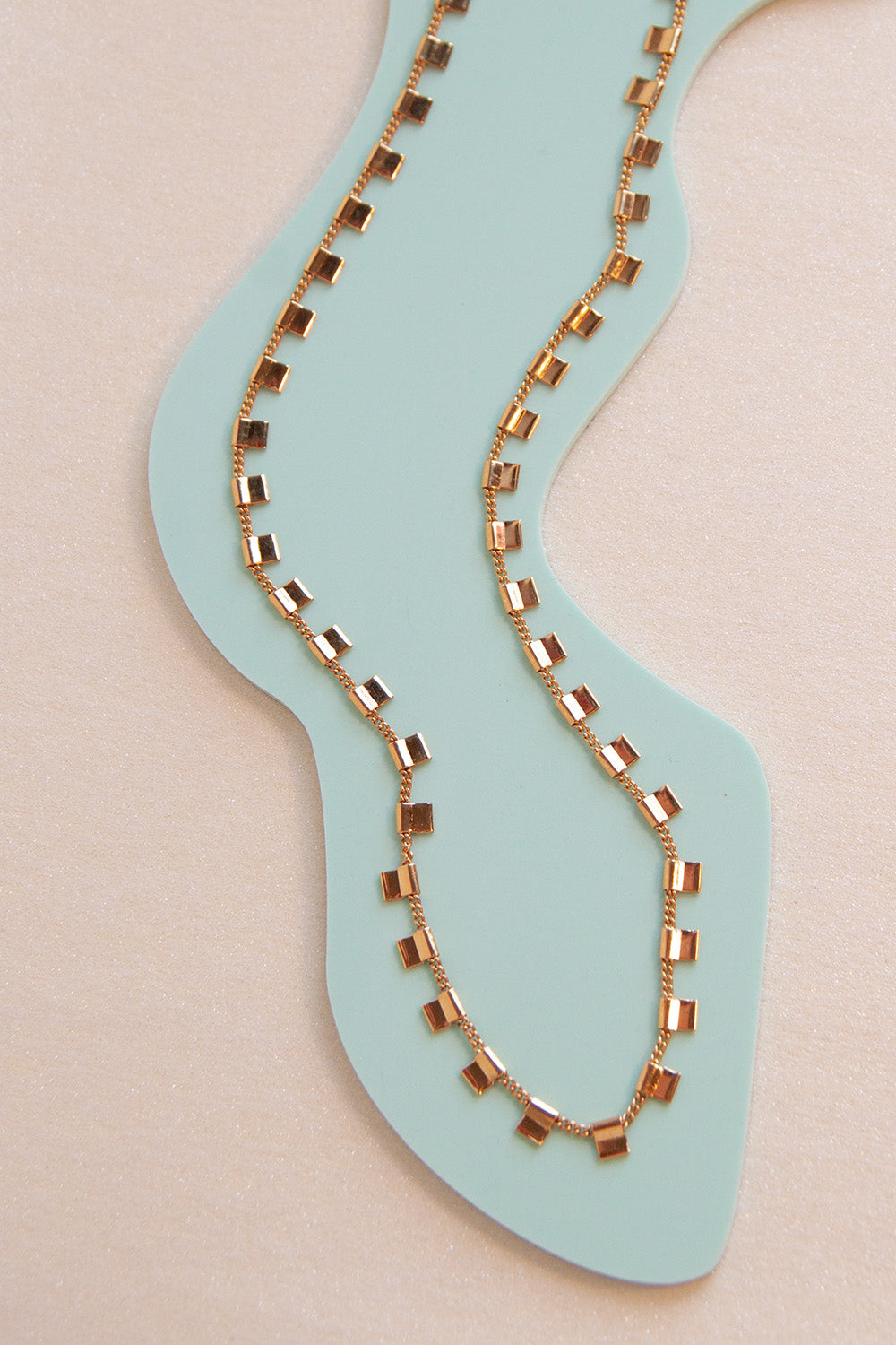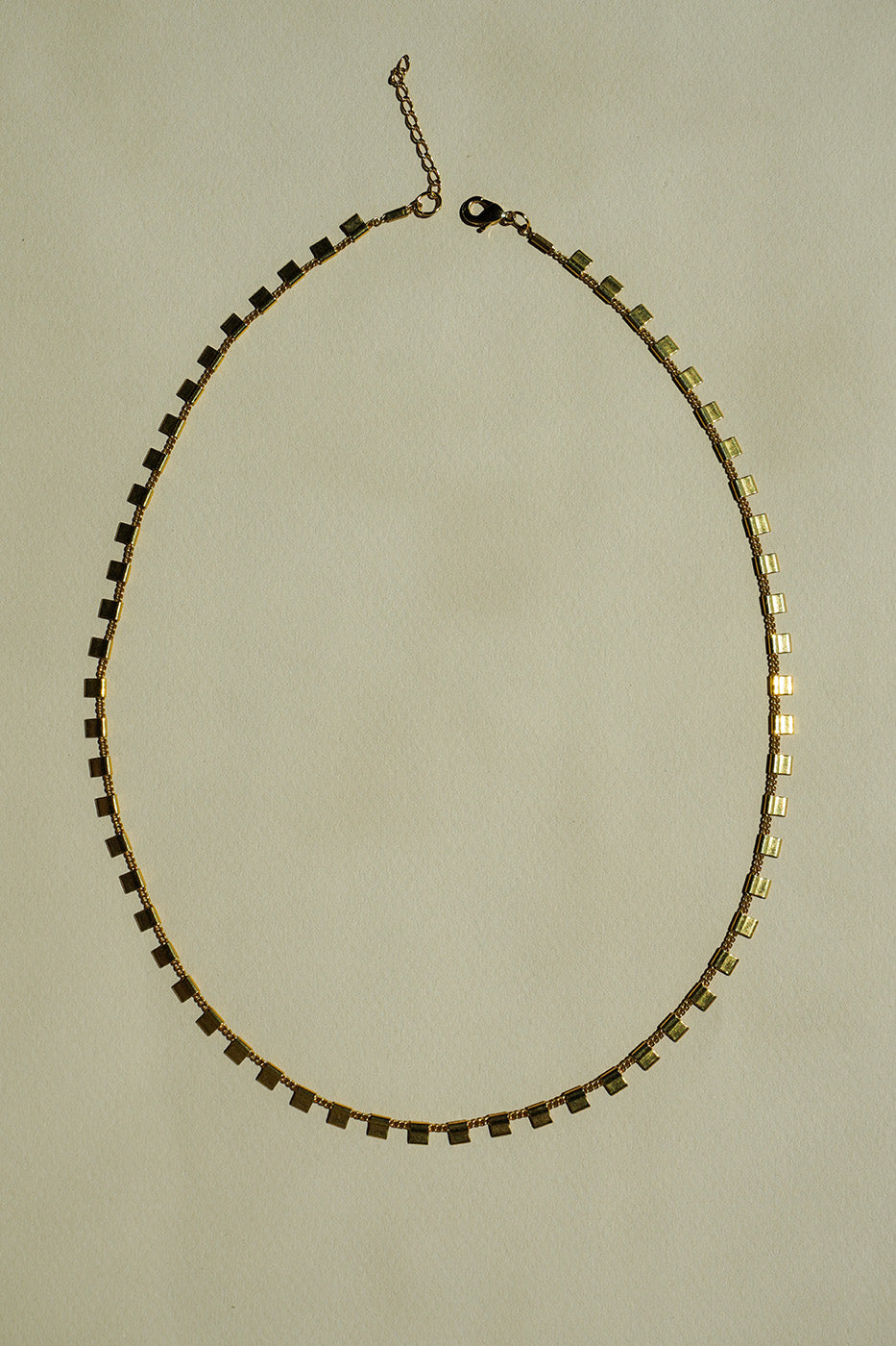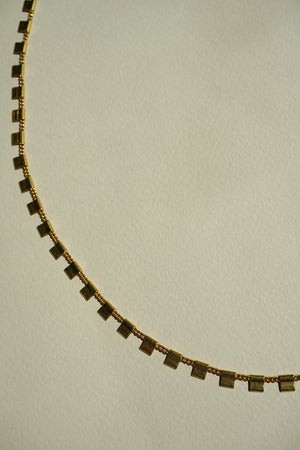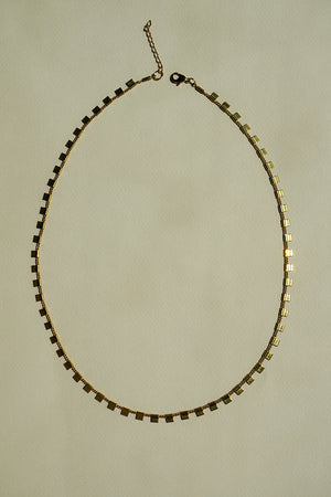 I have been so excited about releasing this new chain because I wear it so much! It is so dainty and fun to wear for an everyday or fancy look. It is also the perfect length. It has tiny squares that go all around your neck. Just like the other necklaces on this collection, it is perfect to layer with other pieces as well. The findings on the chain are gold plated steel and brass. It is recommended that you remove the chain for sport activities or showering. For your jewelry to stay shiny, we recommend cleaning with a micro-fiber cloth after use.