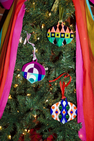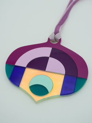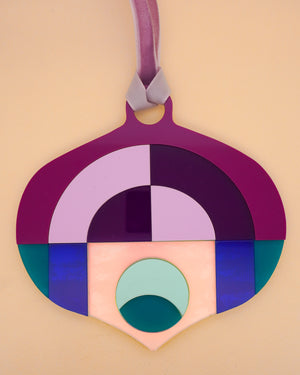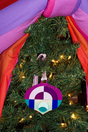 Modern meets magical in the Lagala Ornament. This ornament layers deep purples, soft pinks, and shimmering iridescent into a striking geometric composition that feels both dreamy and bold. The inspiration for this one is a beautiful stained glass window I discovered during a trip to Yucatan. I turned it first into a tufted piece a few years ago and now wanted to turn it into a collector's ornament. Each design is carefully crafted from high-quality acrylic, giving it a glass-like finish that glows in any light. A collectible for design lovers and holiday maximalists alike.