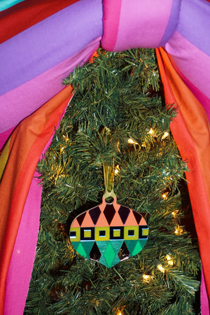 Bold, bright, and bursting with retro cheer — The Sweater Weather ornament is like a mid-century dream come to life. Each geometric piece is hand-assembled from vibrant mirrored and matte acrylics, creating a kaleidoscope of color and texture. Hung from a soft velvet green ribbon, it catches the light and adds instant sparkle to your holiday decor.