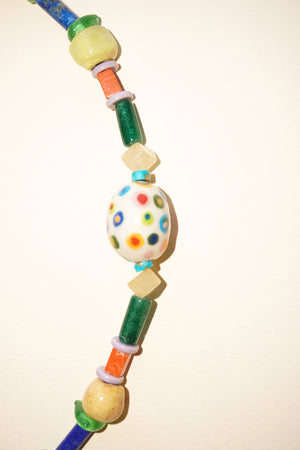 This is a handmade & one-of-a-kind necklace. It is made with a combination of natural stones, ceramic, glass, and gold-plated findings. Necklace measures 17.5." The pieces in this collection are all made in collaboration with local artist Riley Rouse. Learn more about Riley by following her along on @rileymakesthings.