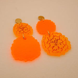 The Marigolds were created in honor of the celebration of day of the death. These detailed acrylic earrings are carefully engraved and hand painted, making the flowers look more realistic. We used two different tones of acrylic and they are incredibly lightweight.