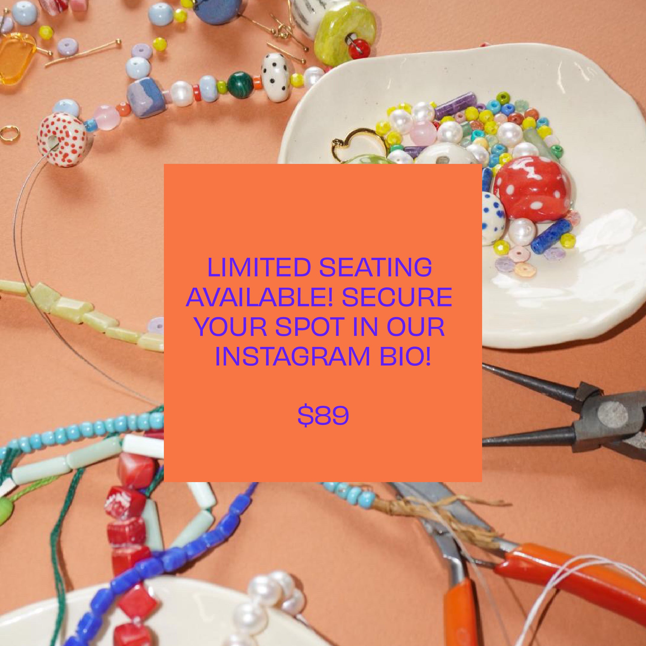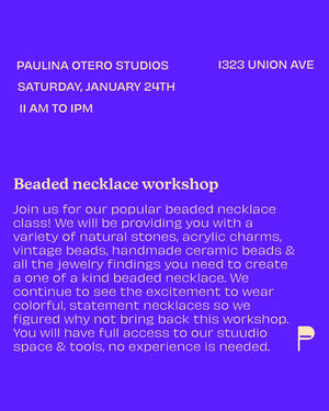 Join us for our beaded necklace workshop; a very popular class that has been a favorite time and time again! We will be providing you with a variety of natural stones, acrylic charms, vintage glass beads, handmade ceramic beads and all the jewelry findings you need to create a one of a kind beaded necklace. We continue to see the excitement to wear colorful statement necklaces so we figured why not offer this as a workshop where you get to have full access to our materials and tools.