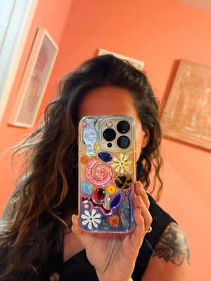 Give our loved Phone Case & Strap workshop a try! Why wouldn't you want a phone case that matches your personality?! During this class you will get to decorate your own phone case and create a matching strap for it. We will provide acrylic shapes, beads, rhinestones, chain and many other components for you to use. We will pour the resin for each case separately and you will be able to pick up/ship the case in the next following days. Resin is toxic so we want to make sure we don't expose participants to it. There is no experience needed for this class, but we do ask that you sign up as early as you can so we can order cases in a timely manner. Once you purchase your ticket, we will email or text you you asking for your ideal phone case size and finish which options are Iridescent or clear (see images for reference).