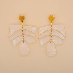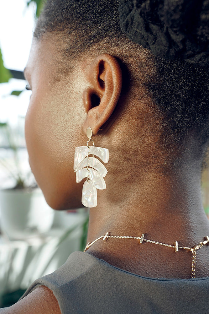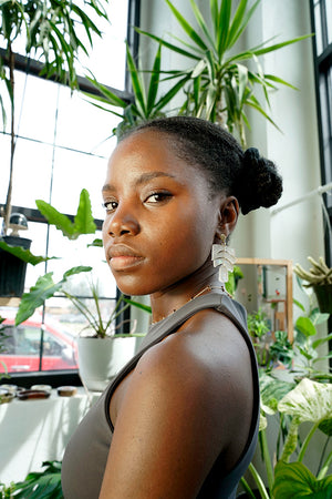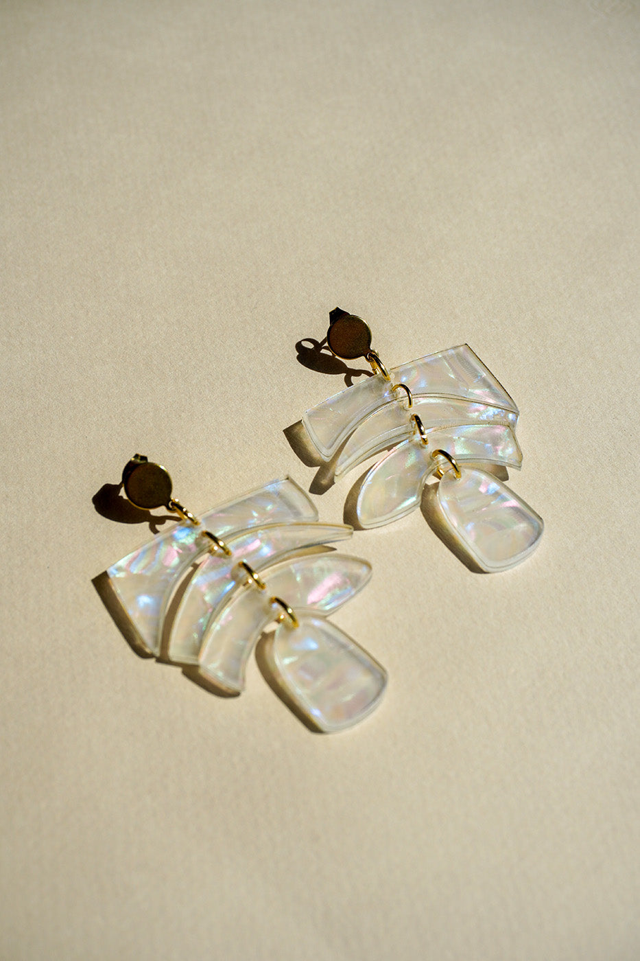 The Balance earrings are inspired by the abstract and minimalist paintings of Virginia Jaramillo titled "Curvilinear series." The forms and colors used in her paintings led to this elegant design. Additionally, Virginia's emphasis on negative space is incorporated into each component, allowing for a unique and flowing look when worn.