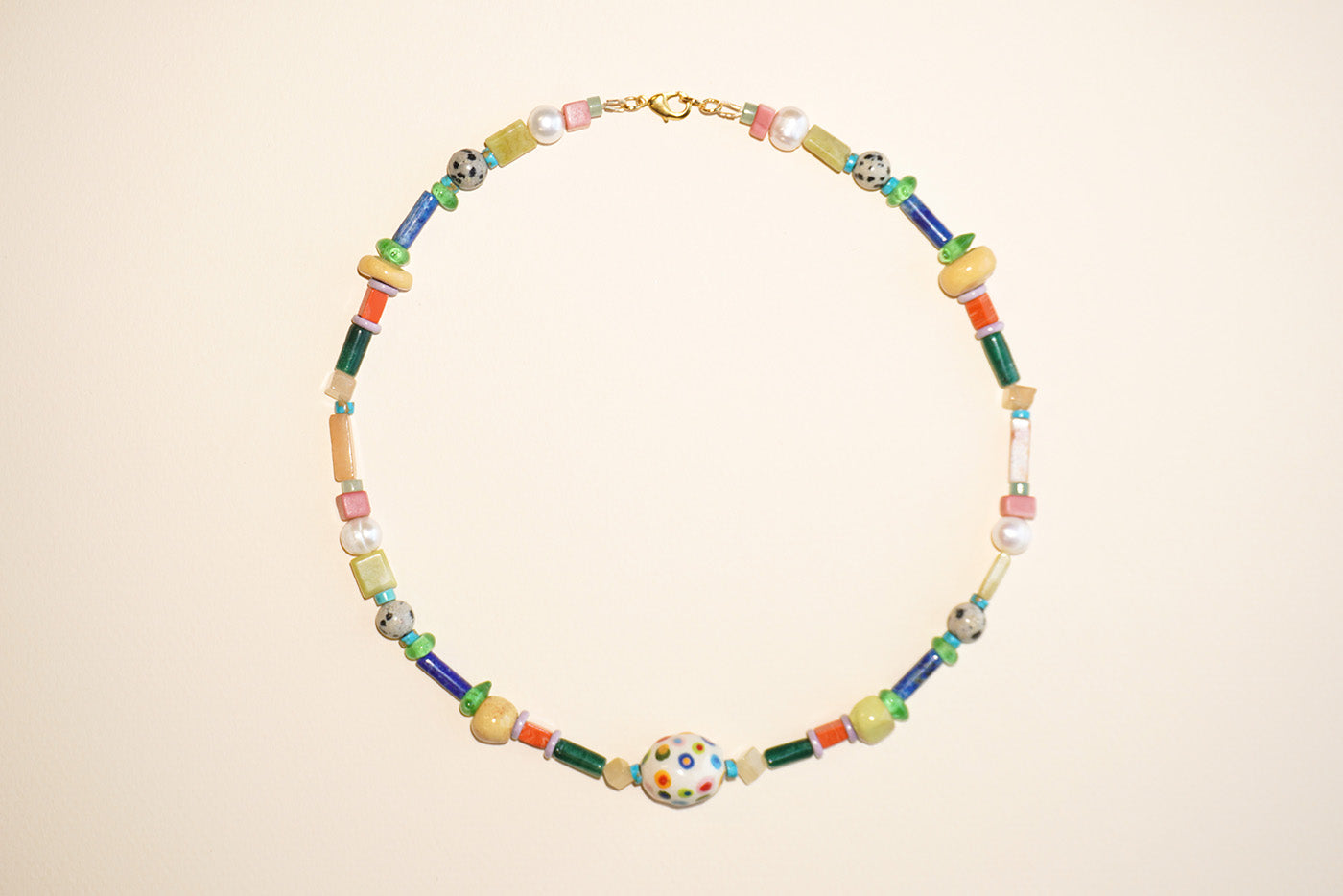 This is a handmade & one-of-a-kind necklace. It is made with a combination of natural stones, ceramic, glass, and gold-plated findings. Necklace measures 17.5." The pieces in this collection are all made in collaboration with local artist Riley Rouse. Learn more about Riley by following her along on @rileymakesthings.