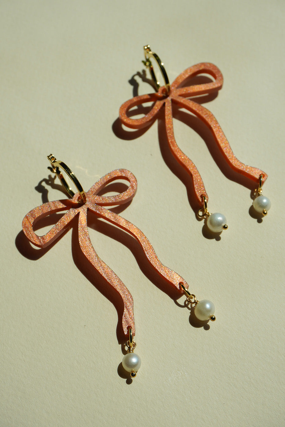 These bow hoops shimmer with a warm, coppery glow thanks to their glitter-flecked acrylic design. The rich orange tone paired with delicate pearls creates a striking contrast—ideal for fall days or golden hour styling. Each bow measures 2.5" by 1.75." Findings are gold-plated steel. Select if you prefer with set of hoops or just the set of charms.
