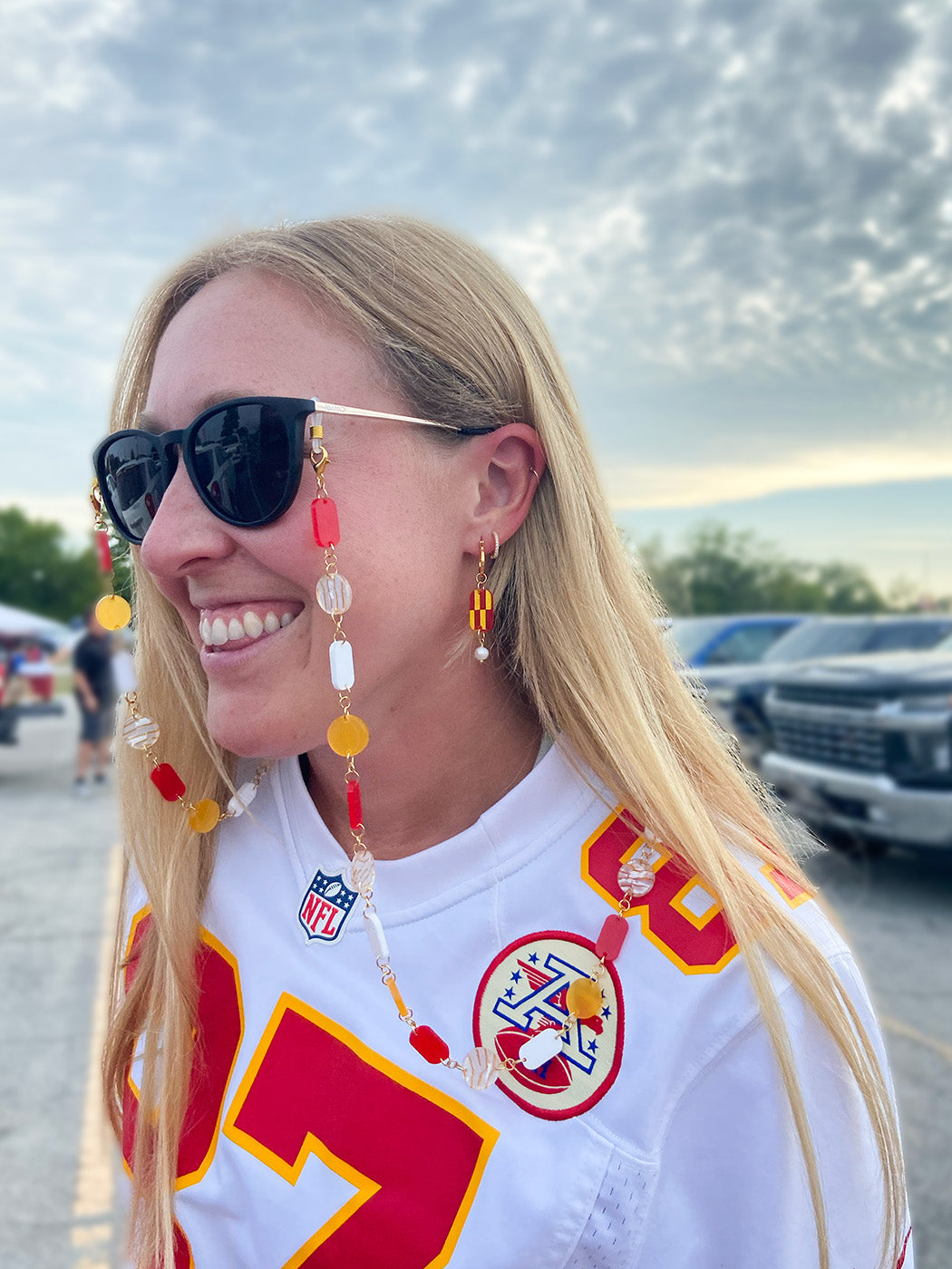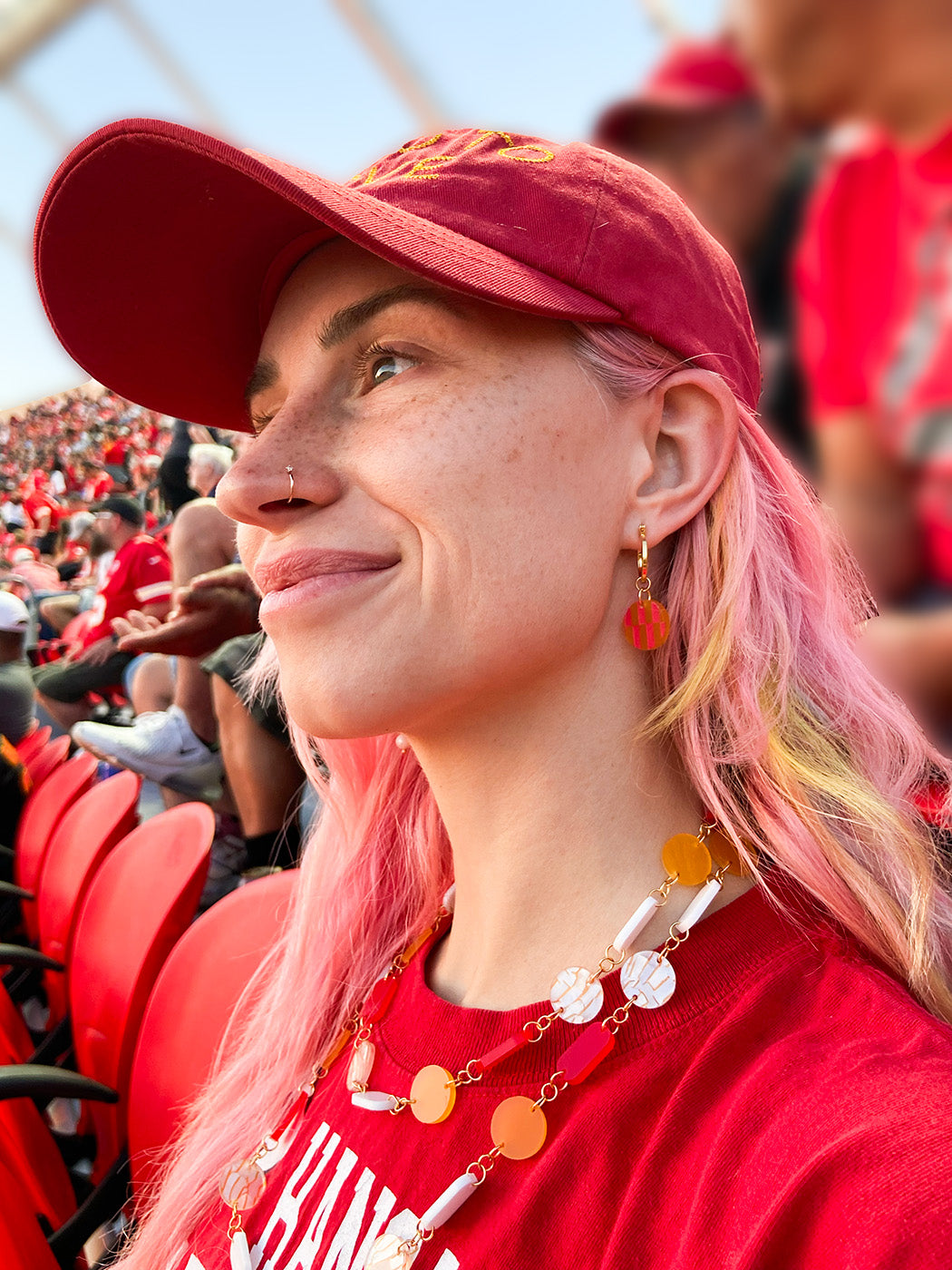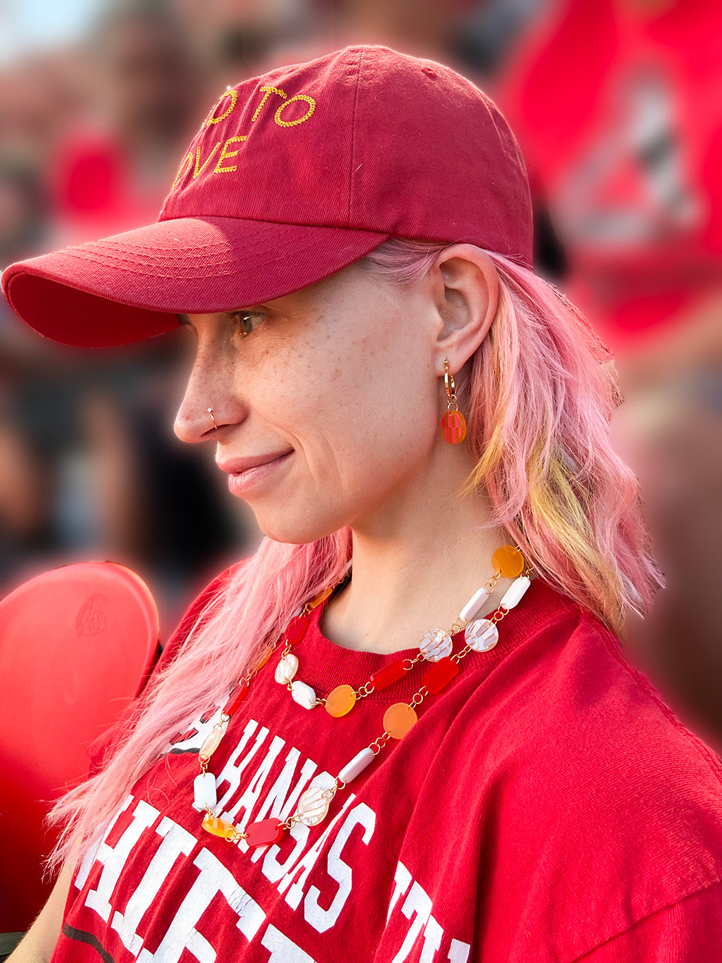 We had to bring another one of our OG and most loved designs for this football season. These checkered asymmetrical hoops add a playful touch to your outfit! They are are available in two color waves; frosted red acrylic with painted yellow details and daffodil acrylic with red painted details. They both have freshwater pearl details. These hoops measure 0.125" by 1.25" by 0.5" and are plated in gold. Don't hesitate to show off these cool, everyday earrings. The checkerboard trend continues to be a favorite! All of our jewelry is made in Kansas City and it's incredibly lightweight.