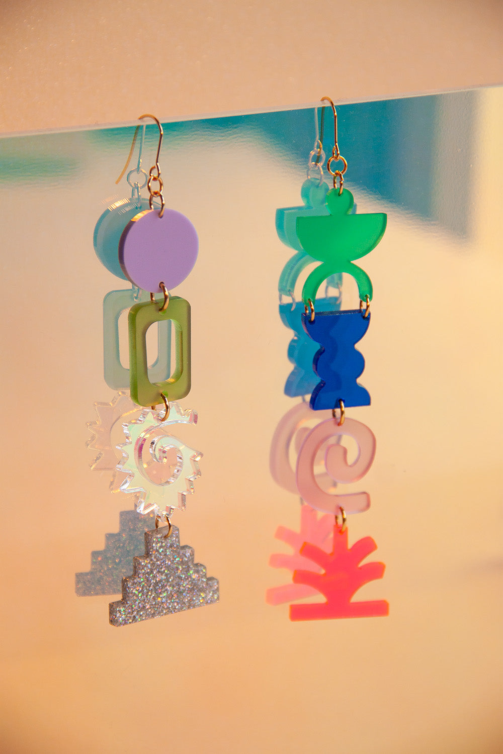 A wearable piece of art—these playful statement earrings were inspired by Mayan symbolism. They are like hanging mobiles that will bring colorful reflections to your ears. Crafted with specialty acrylics and gold-plated hooks, each pair dances with movement and light. Bold, fun, and beautifully unique—they’re made to turn heads and lift moods wherever you go.