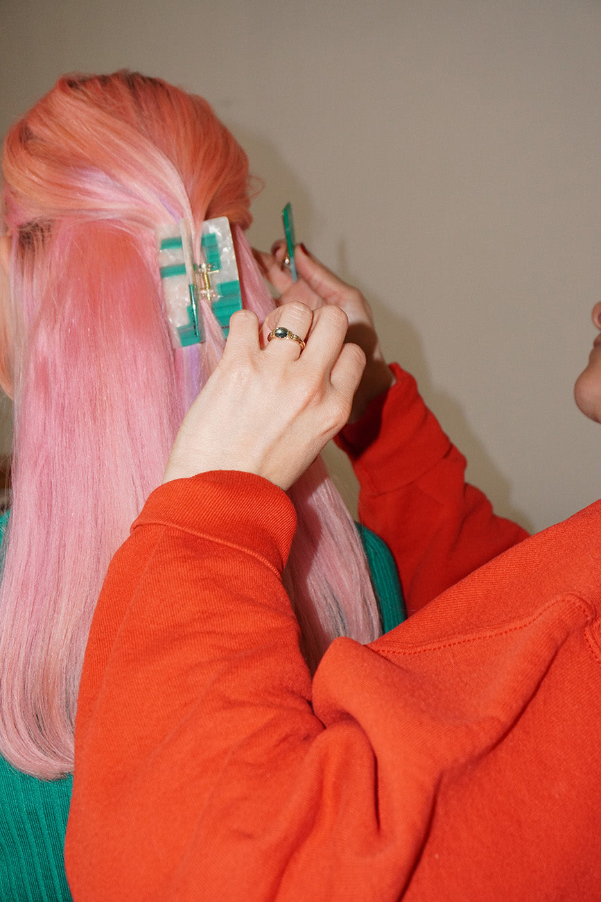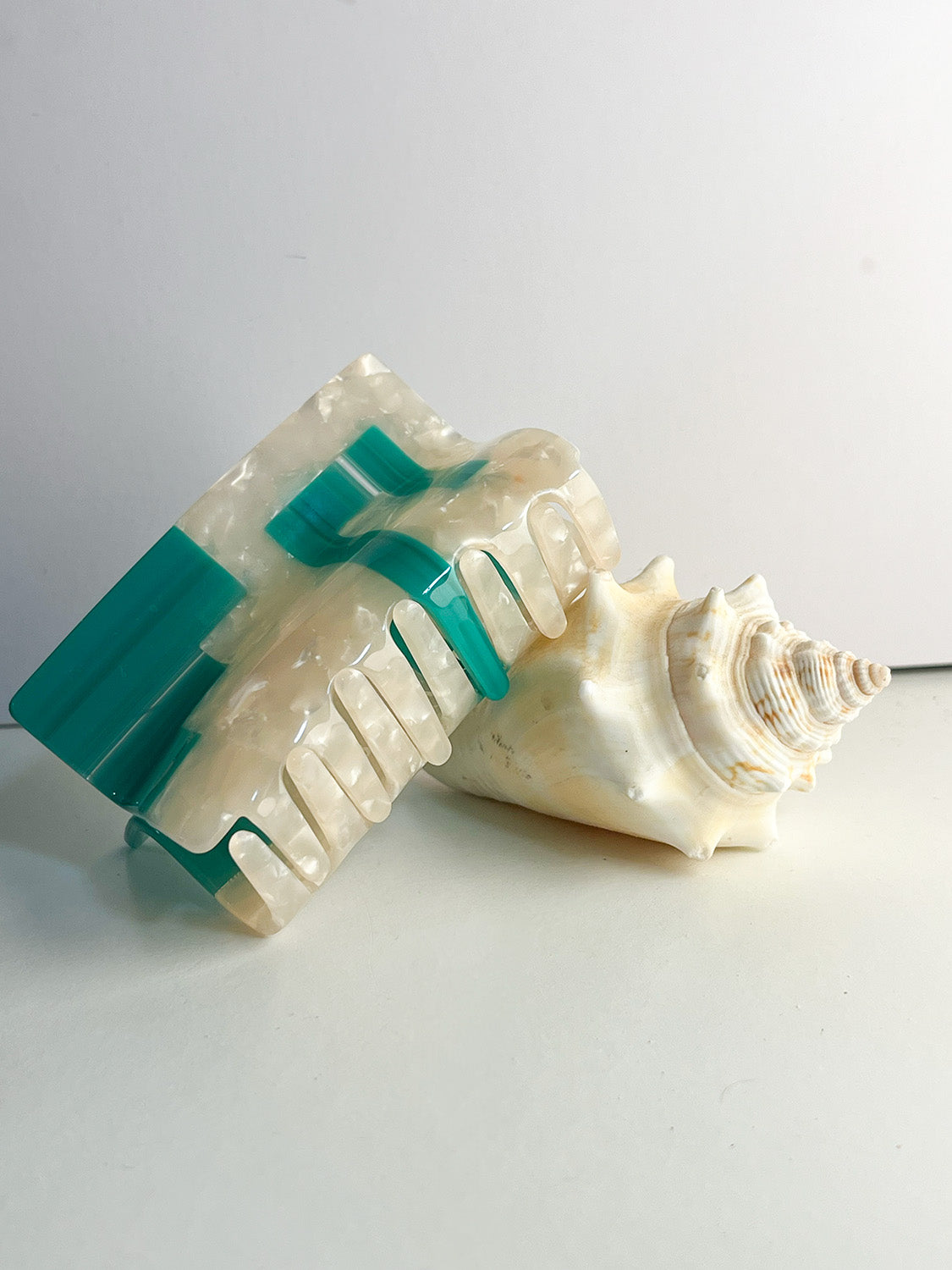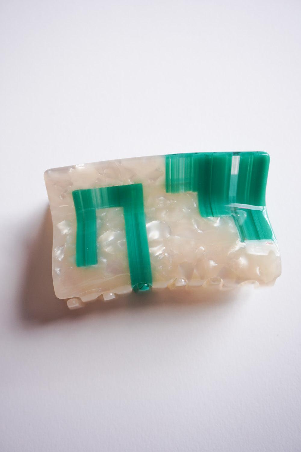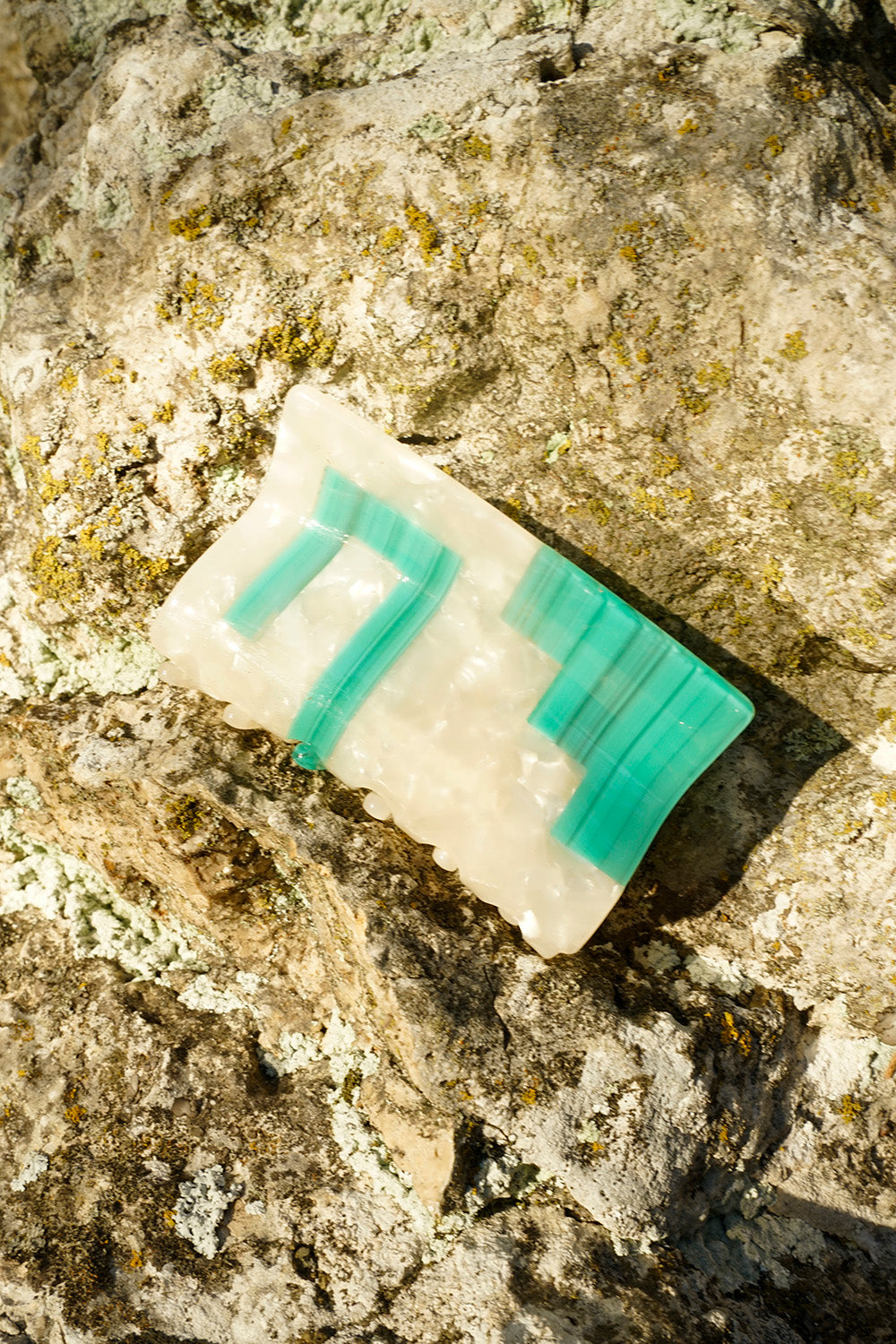 The Greca Hair-Claw in Beach features a fun geometric spiral inspired by Mayan art. This medium-sized claw is perfect for holding your hair up in a bun or half bun, especially if you have medium to long hair. Choose from playful color combos like periwinkle with neutrals, neon pink with light pink, or teal with cream for a stylish pop. Add a cool, creative touch to your hair with this easy-to-wear claw!