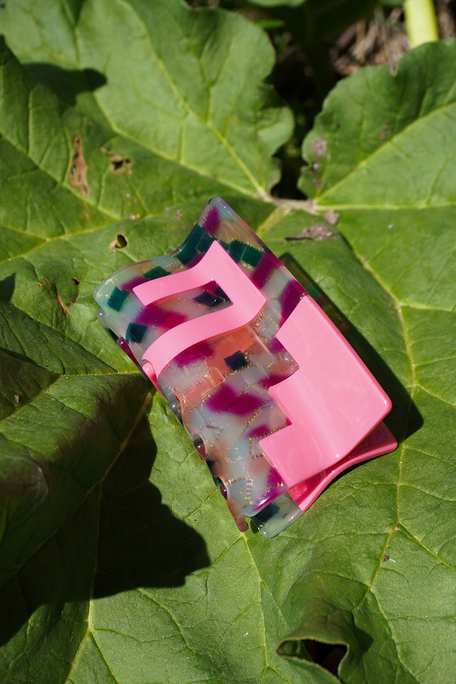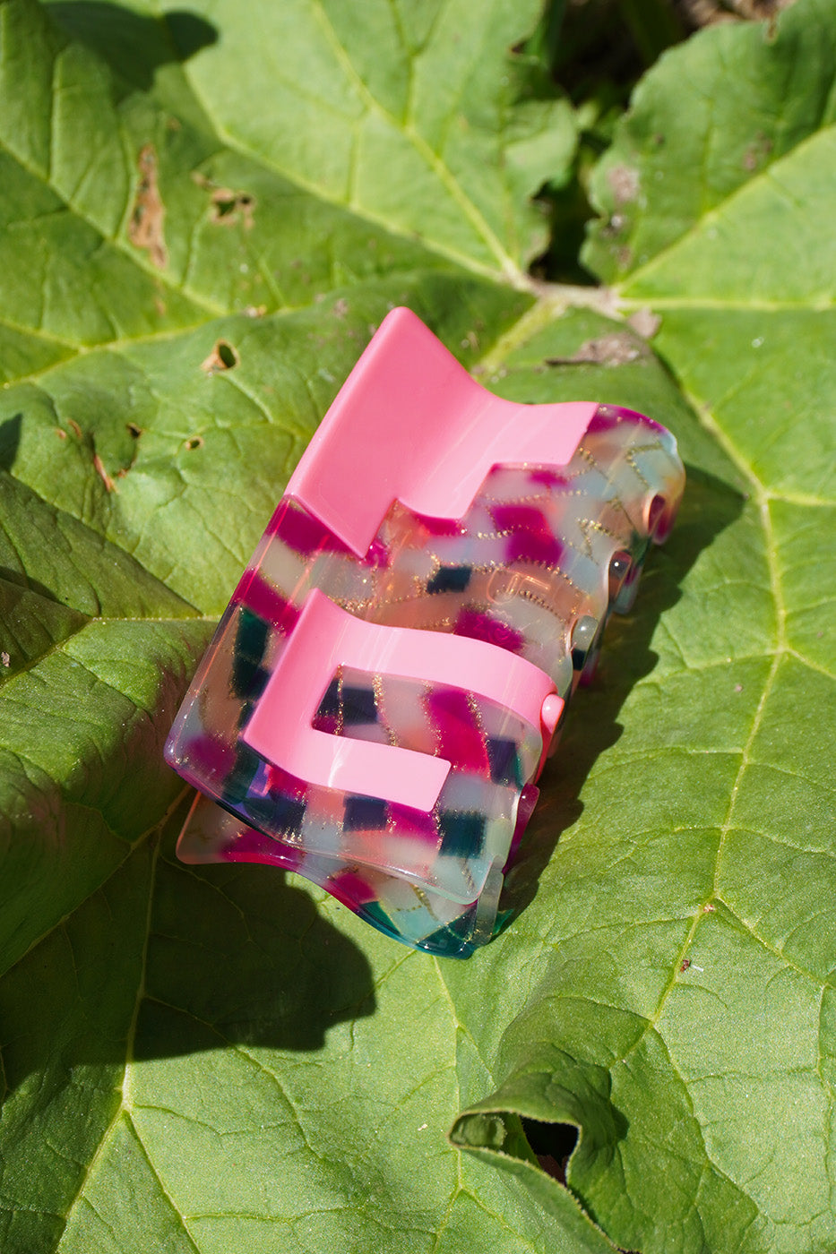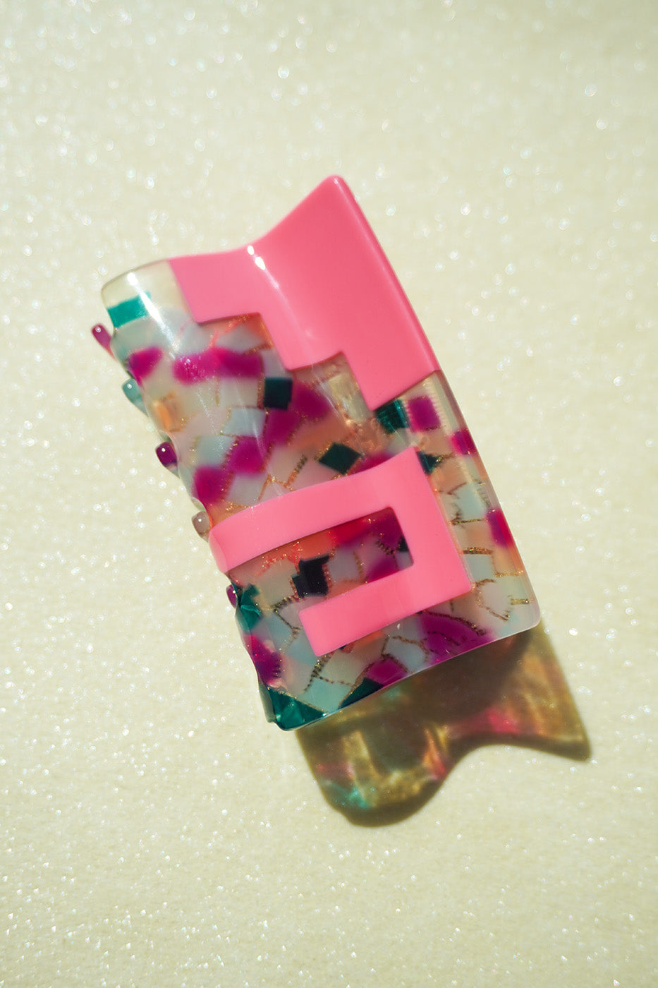 The Greca hair-claw features a fun pink and confetti design inspired by the cool Mayan rectangular spiral pattern. It’s just the right size to hold medium to long hair up in a bun or half bun, adding a playful pop to your look while keeping your hair secure.