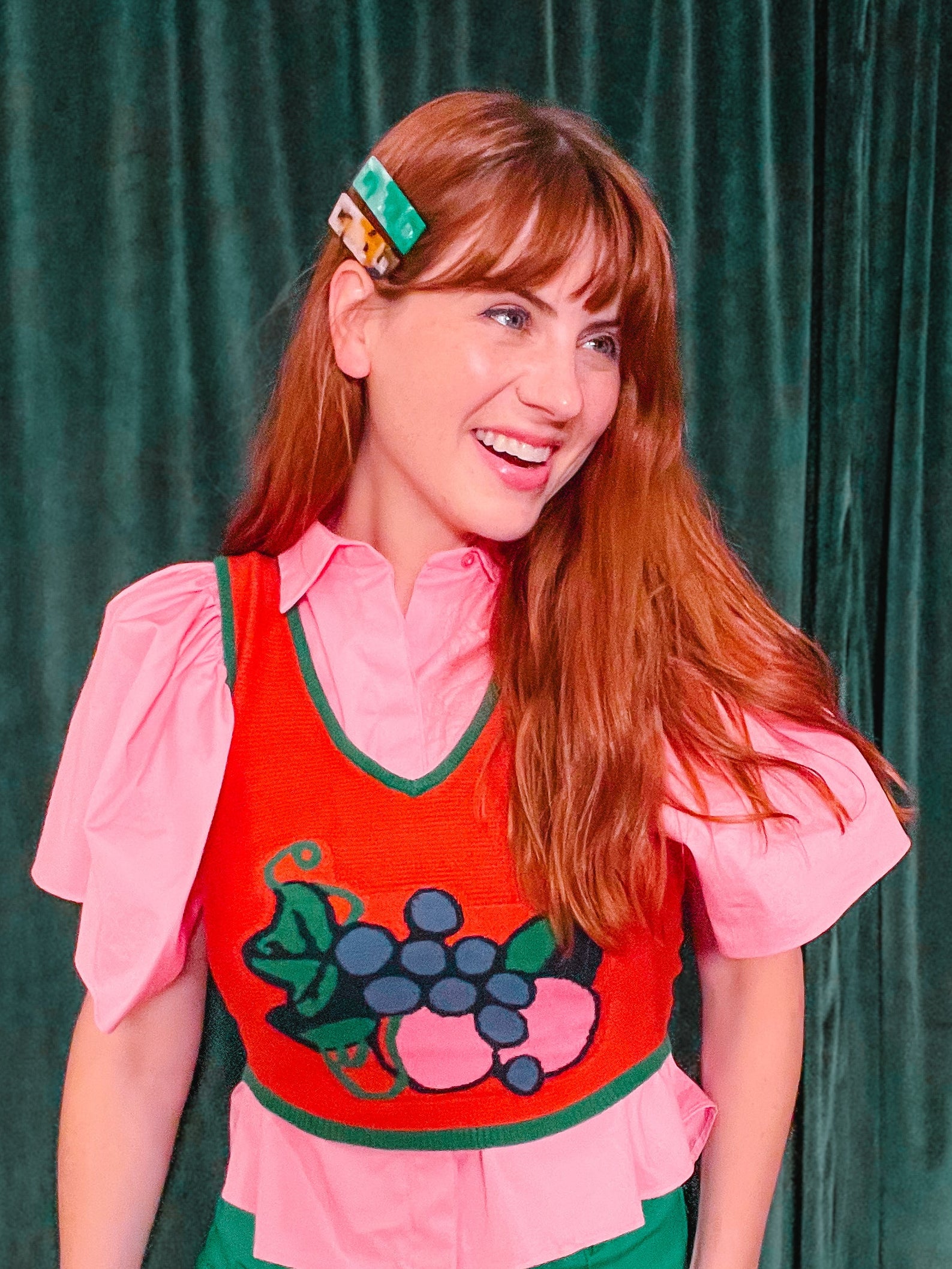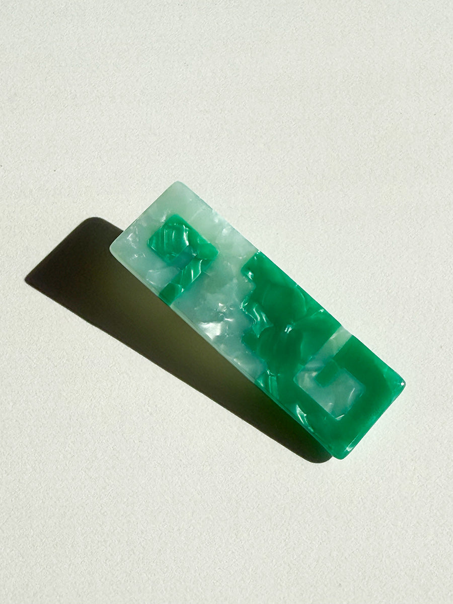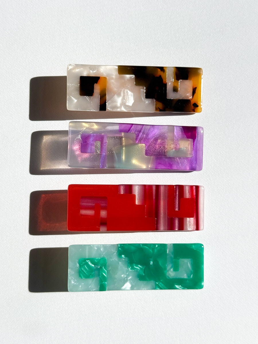 The Greca Hair-Clips bring fun Mayan-inspired style to your look with their cool geometric pattern. Each clip mixes two textures for an eye-catching twist. Choose your favorite color, buy single clips, or grab a set to save $5. Made from acetate and metal, they’re perfect for spicing up any hairstyle!