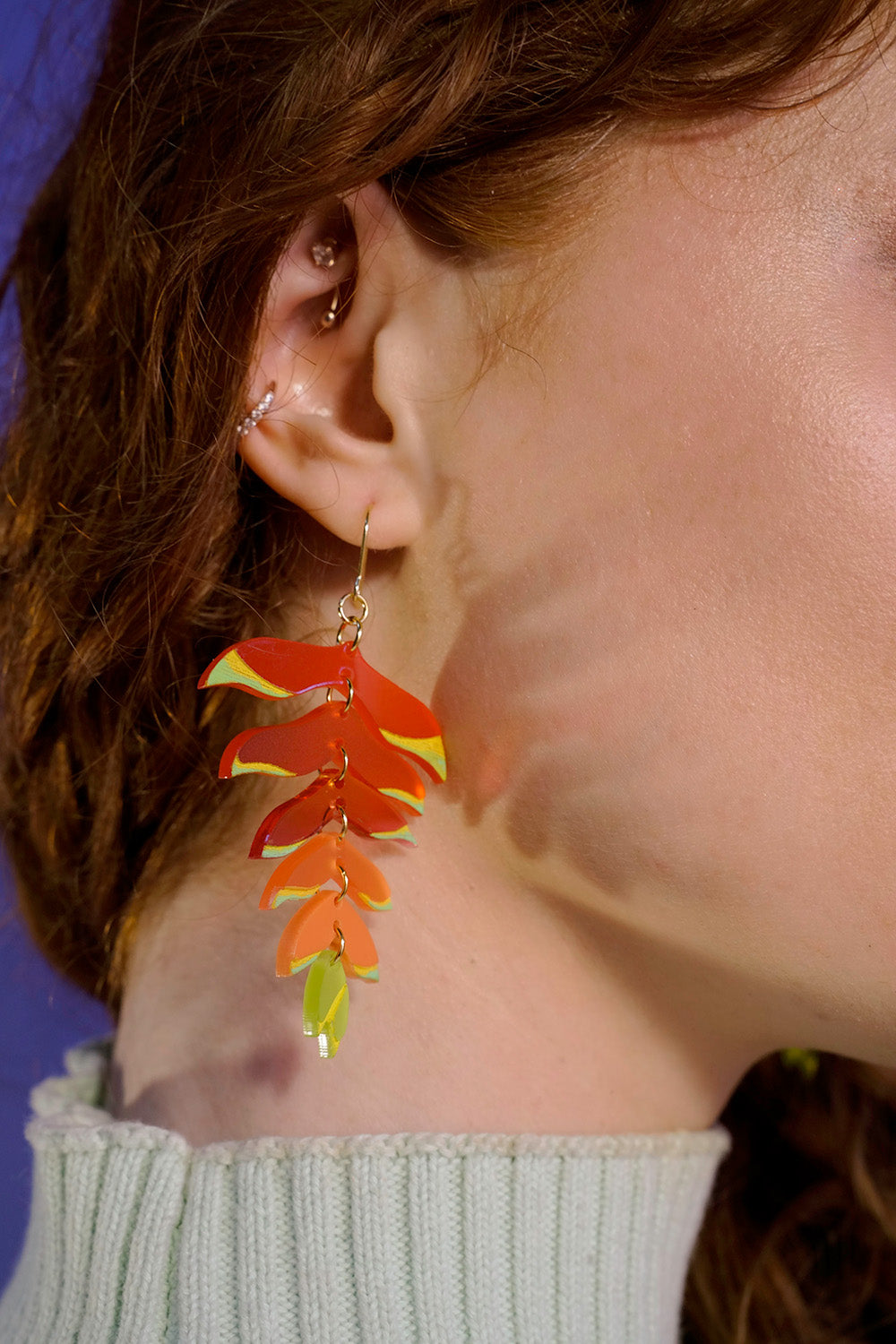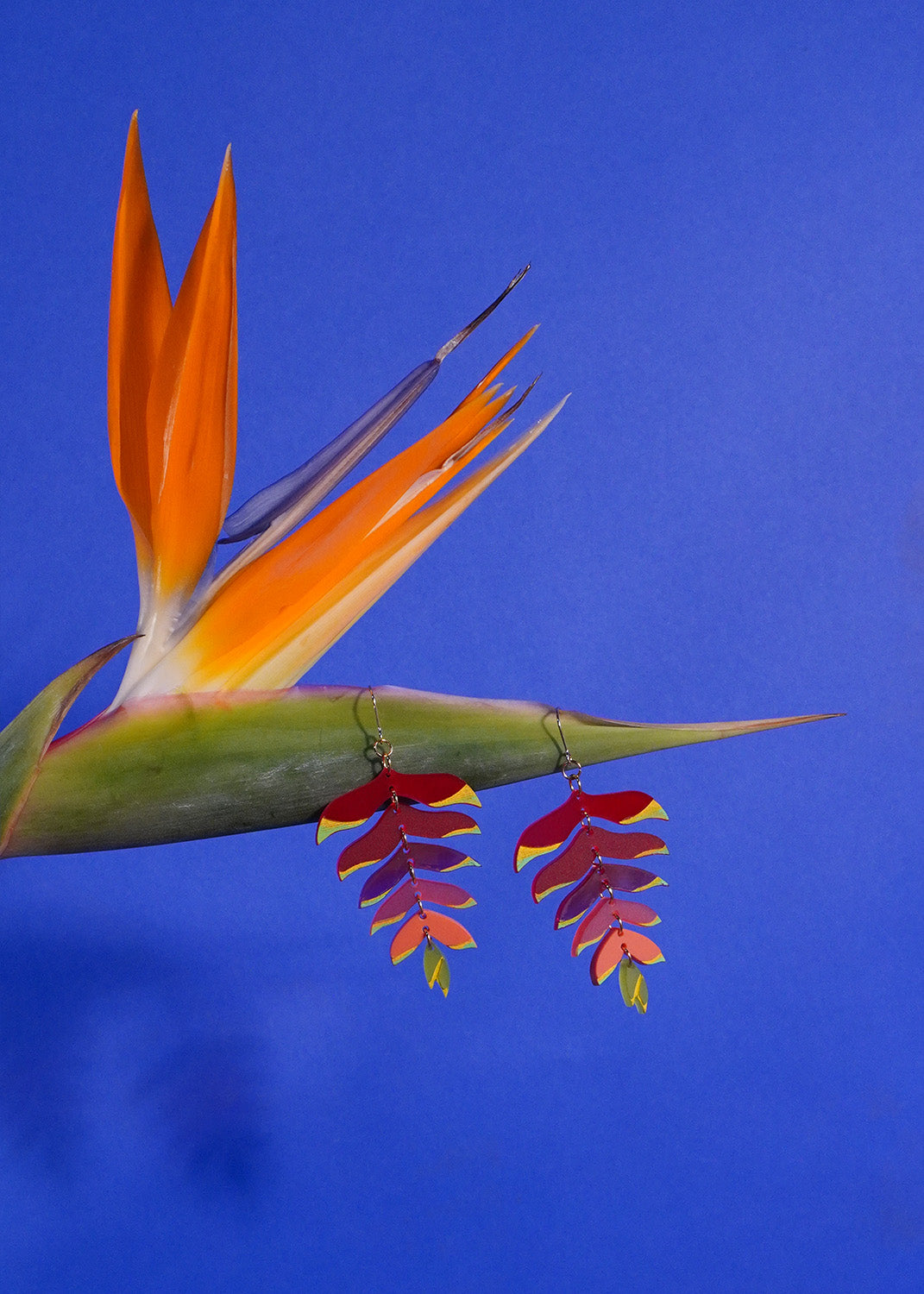 We just had to have Heliconia earrings in our statement earrings collection! These tropical plants were a big part of my childhood, growing up in the Yucatan peninsula. Their funky flowers and tall stems caught my eye, and I couldn't resist capturing their vibrant colors and movement in my earring design. Each part of this earring is carefully engraved and hand-painted. Even though these earrings might look big in size, they are pretty lightweight because of the material they are made with.