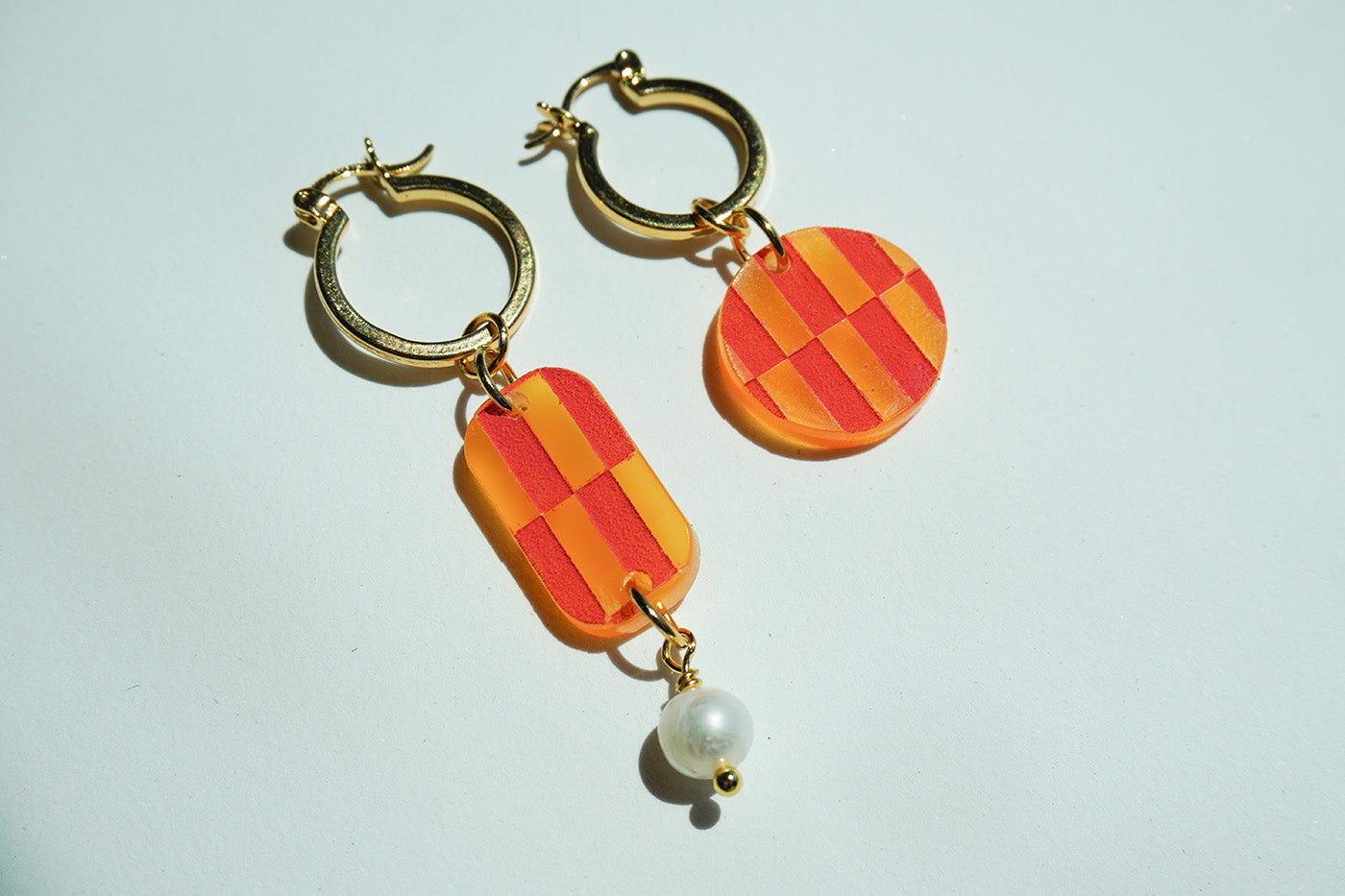 We had to bring another one of our OG and most loved designs for this football season. These checkered asymmetrical hoops add a playful touch to your outfit! They are are available in two color waves; frosted red acrylic with painted yellow details and daffodil acrylic with red painted details. They both have freshwater pearl details. If you already own a pair of our hoops, in this listing you will be purchasing a set of charms only. They will come with jump rings so you can easily insert in your hoops.
