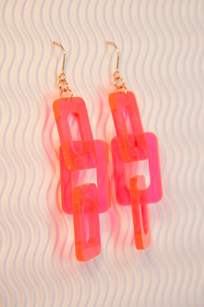 Say goodbye to boring earrings, because our mini link earrings in neon pink are sure to become your new favorite! These playful and lightweight earrings will add a pop of color and personality to all your everyday outfits. Made with acrylic and plated gold steel, each earring measures 0.125" x 2.5" 0.8." These chain-link earrings will literally make your ears glow with style. Don't miss out on this top-selling style!