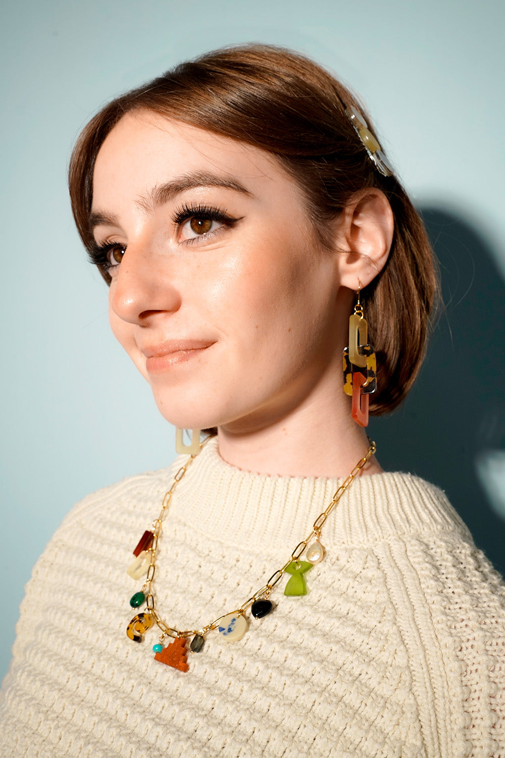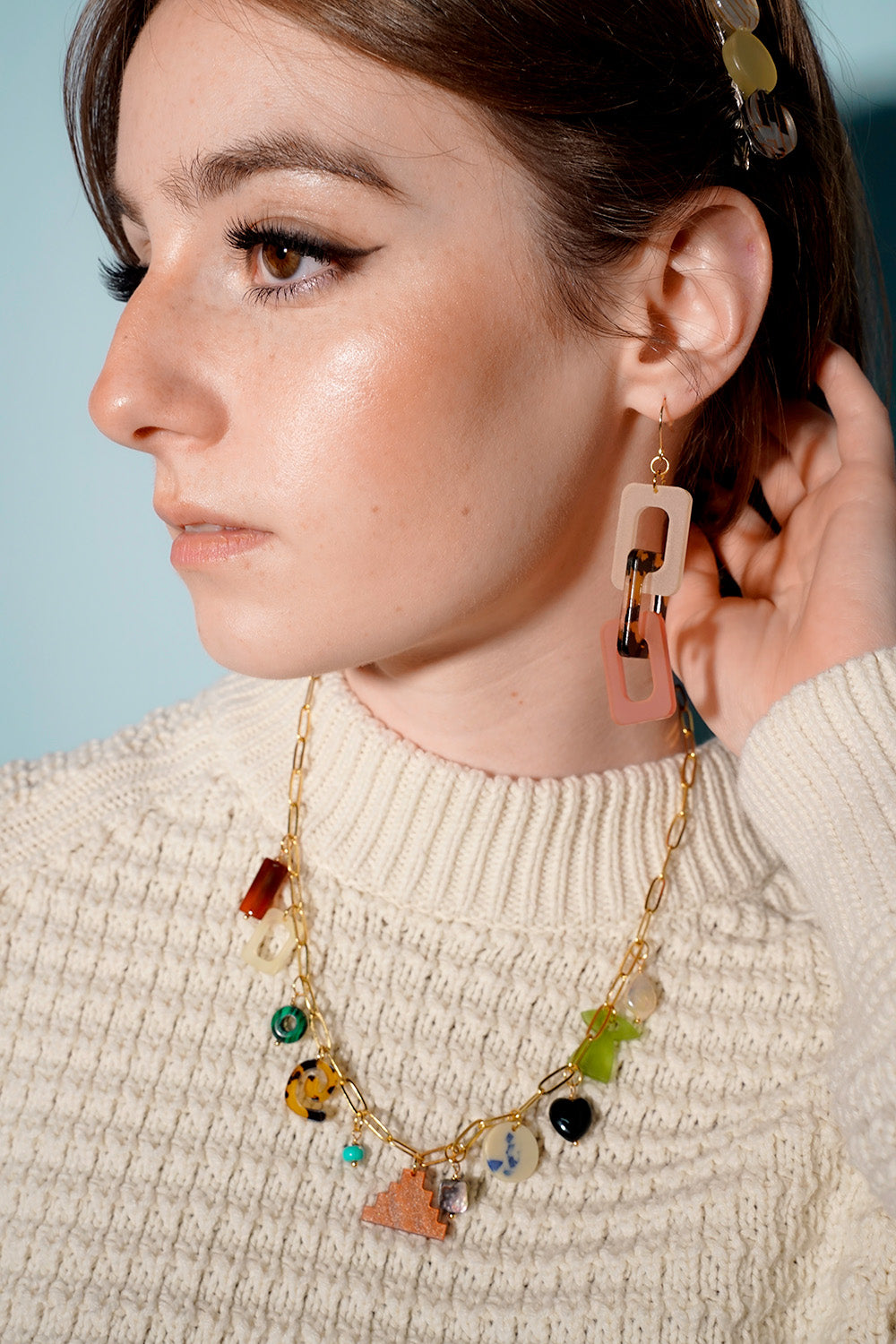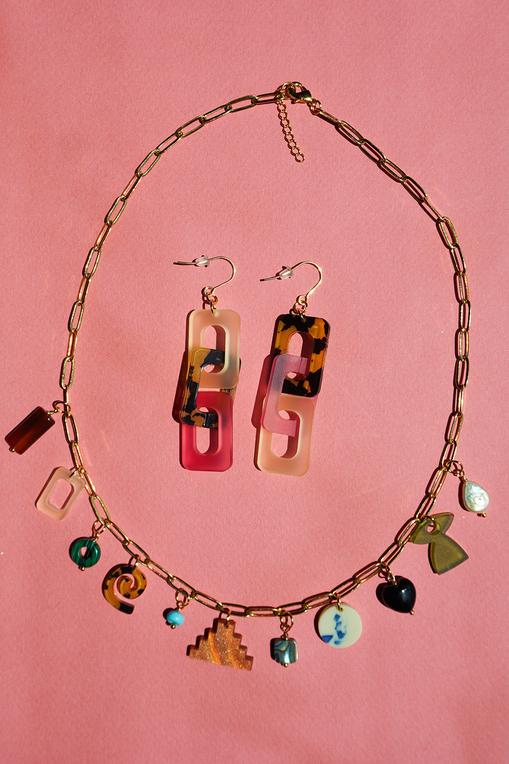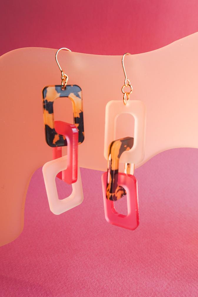 This fresh take on a classic link style combines soft blush tones, frosted citrus accents, and a bold tortoiseshell pattern for a look that’s both fierce and flirty. Made from lightweight acrylic, these earrings are designed for all-day comfort with a stylish edge, and the gold-plated hooks add a little touch of elegance. Perfect for adding a bit of fun and texture to any outfit, these earrings are a must for your adventurous side while embracing the feminine.