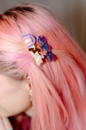 These mobile hair clips come in four fun styles, each set with unique shapes and textures. Each clip has its own vibe, so you can pick which set matches your style perfectly. Note this is a medium size clip and it will hold more hair than our regular hair-clips. This set will include two of the same style hair-clips. Purchase more than one hair accessory and automatically get $5 OFF.