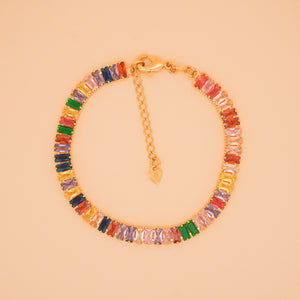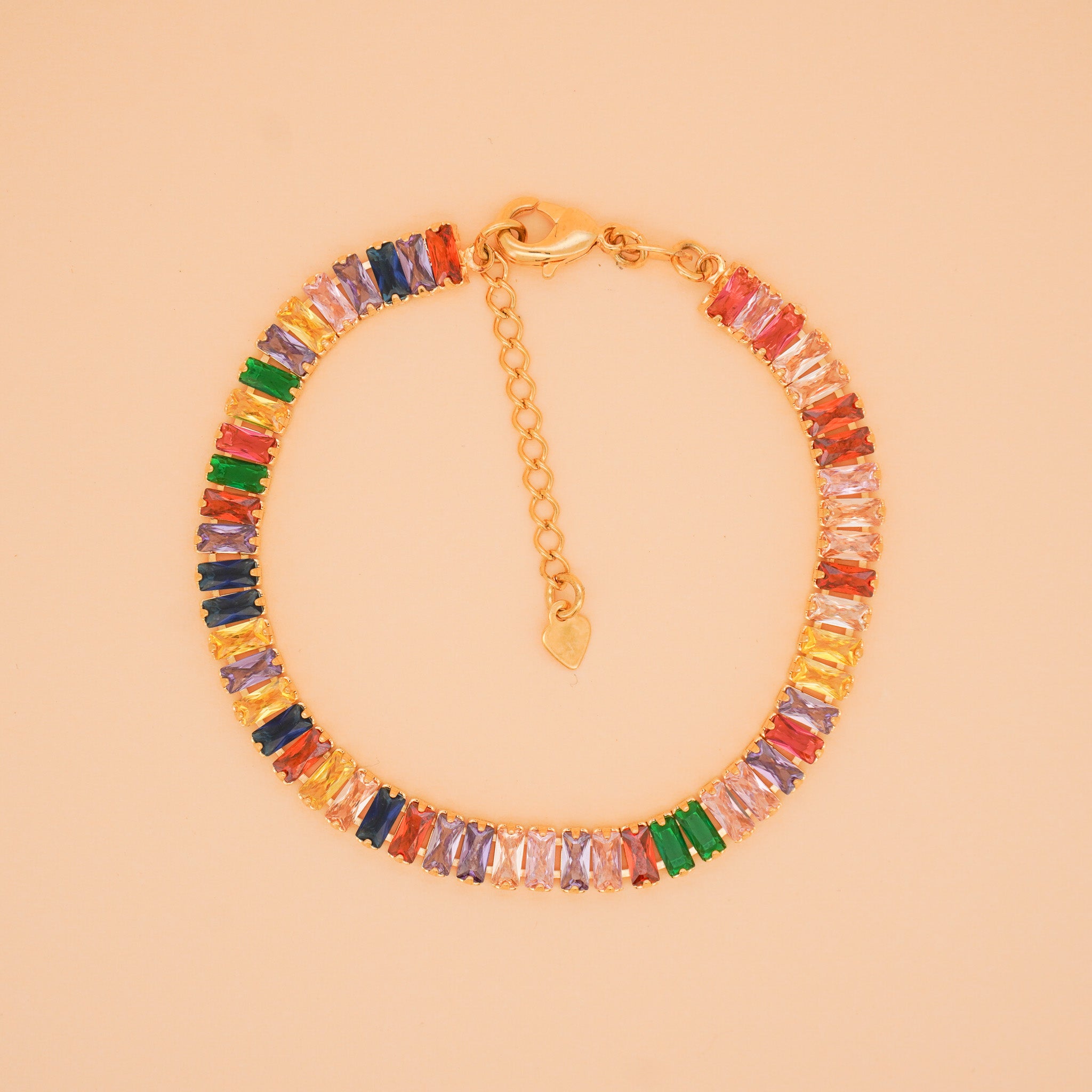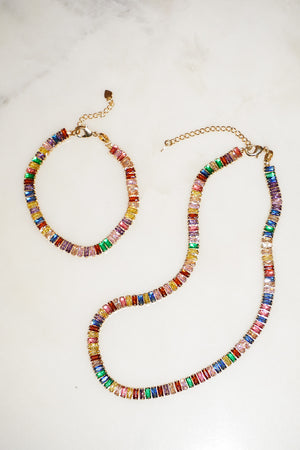 Turn heads with this vibrant duo designed to bring maximum sparkle and color to your look. Featuring an 18K gold-filled chain, both the necklace and bracelet are adorned with shimmering multi-color cubic zirconia stones that catch the light beautifully. Perfect for a girls’ night out, special occasion, or whenever you want to add a bold, playful edge to your style. Wear them together for a coordinated look or mix and match with your favorite dainty pieces for layered glam. Select if you prefer to purchase pieces individually or as a set.