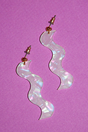 The squiggles continue to be such a popular fun shape! These earrings are on the smaller side but they are perfect for every day wear if you need a unique accessory. They are available in a variety of unique textures and colors. Made with acrylic and plated gold steel findings. Earrings measure 0.125" by 2" by .5."