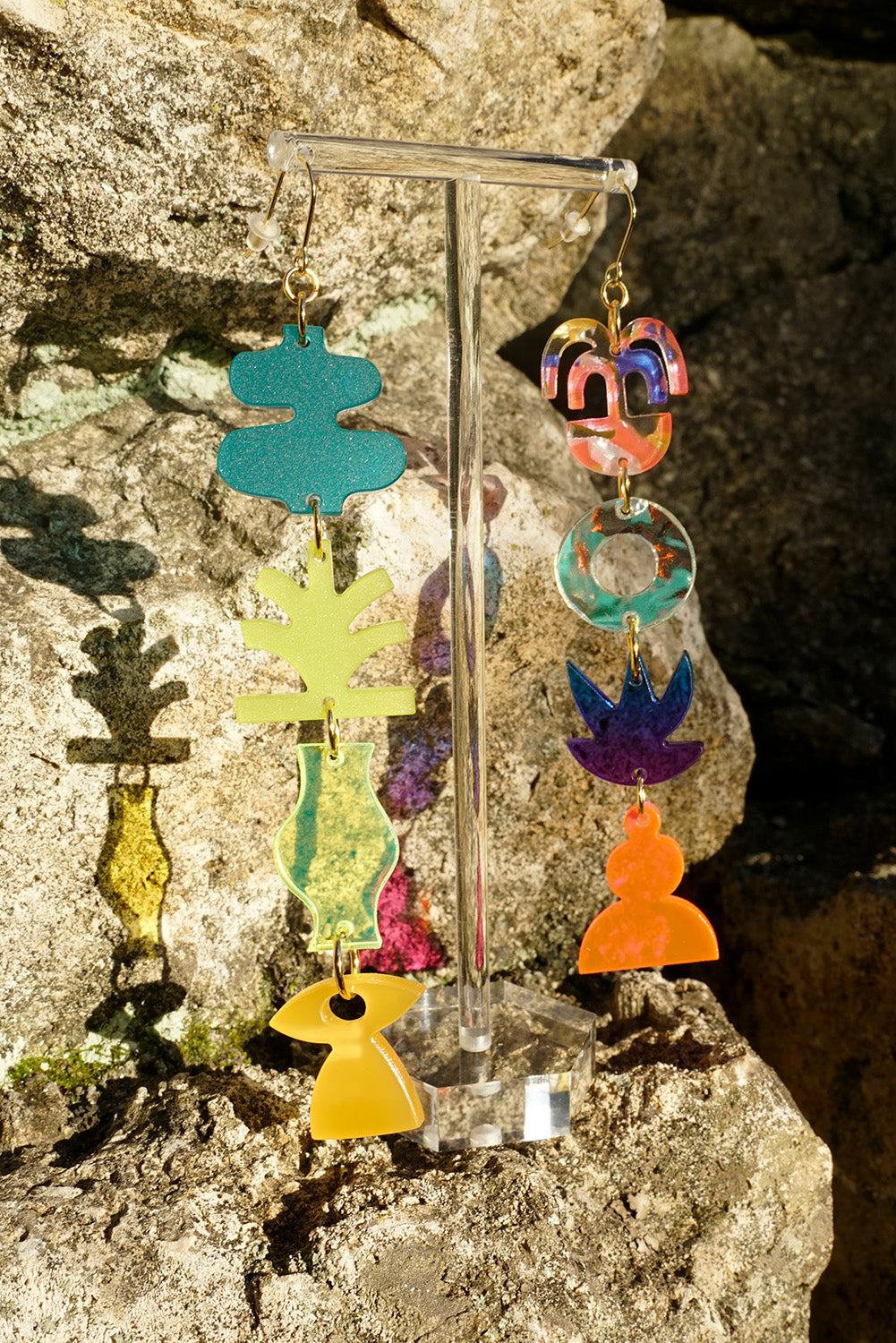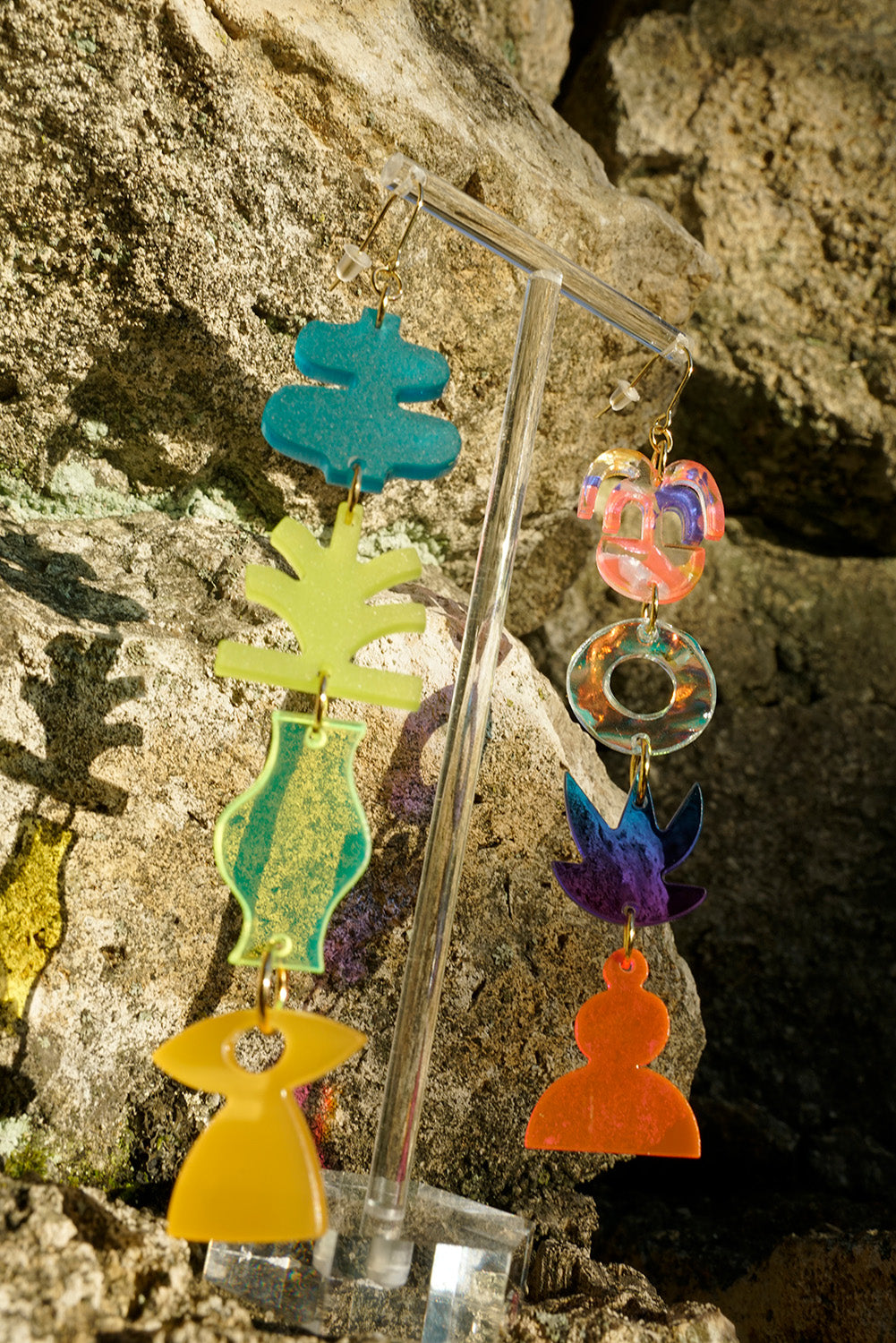 Introducing the Summer Mobile earrings - a lively and whimsical complement to any outfit! With a blend of new unique shapes and textures, these earrings exude a playful vibe. The vibrant mix of colors and materials evokes the enchanting spirit of a rainbow mermaid. Each shape in these earrings evokes the beauty of sea glass and the treasures waiting to be discovered in the sand.