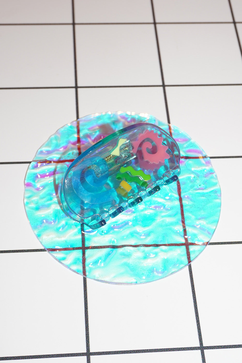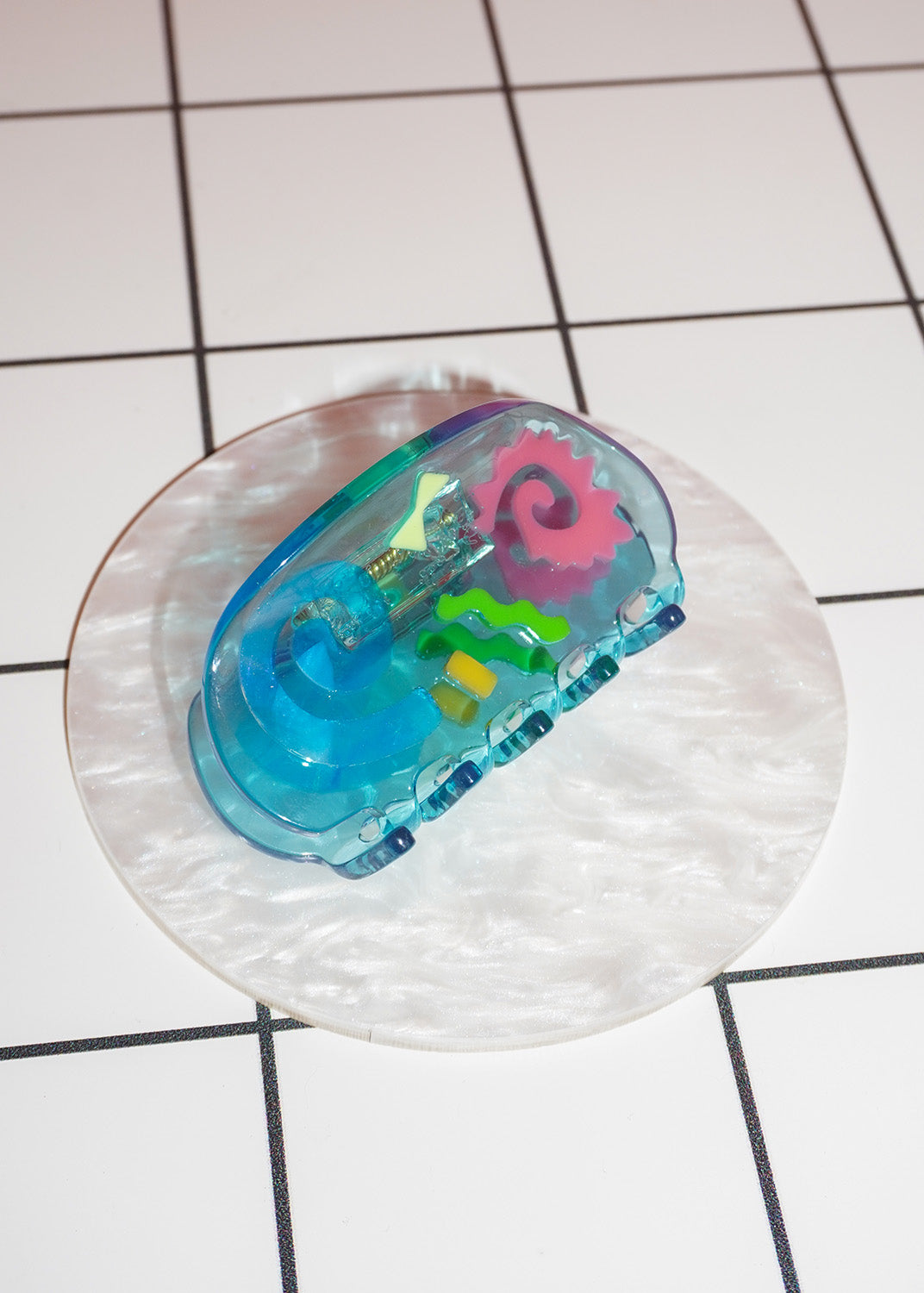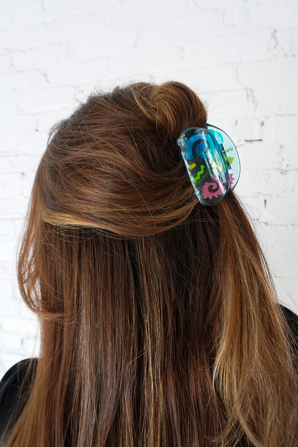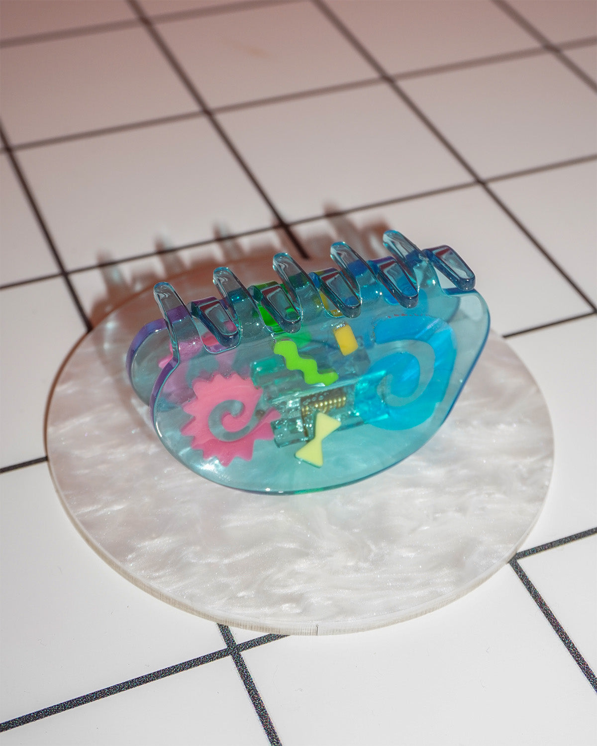 This hair-claw style that is inspired by our universe of playful shapes floating around. This is a medium size hair-claw is similar in size to our first pyramid claw. It is a very special design that is made with five different types of acetate. Get more than one hair-claw and you will automatically get $5 OFF your order.